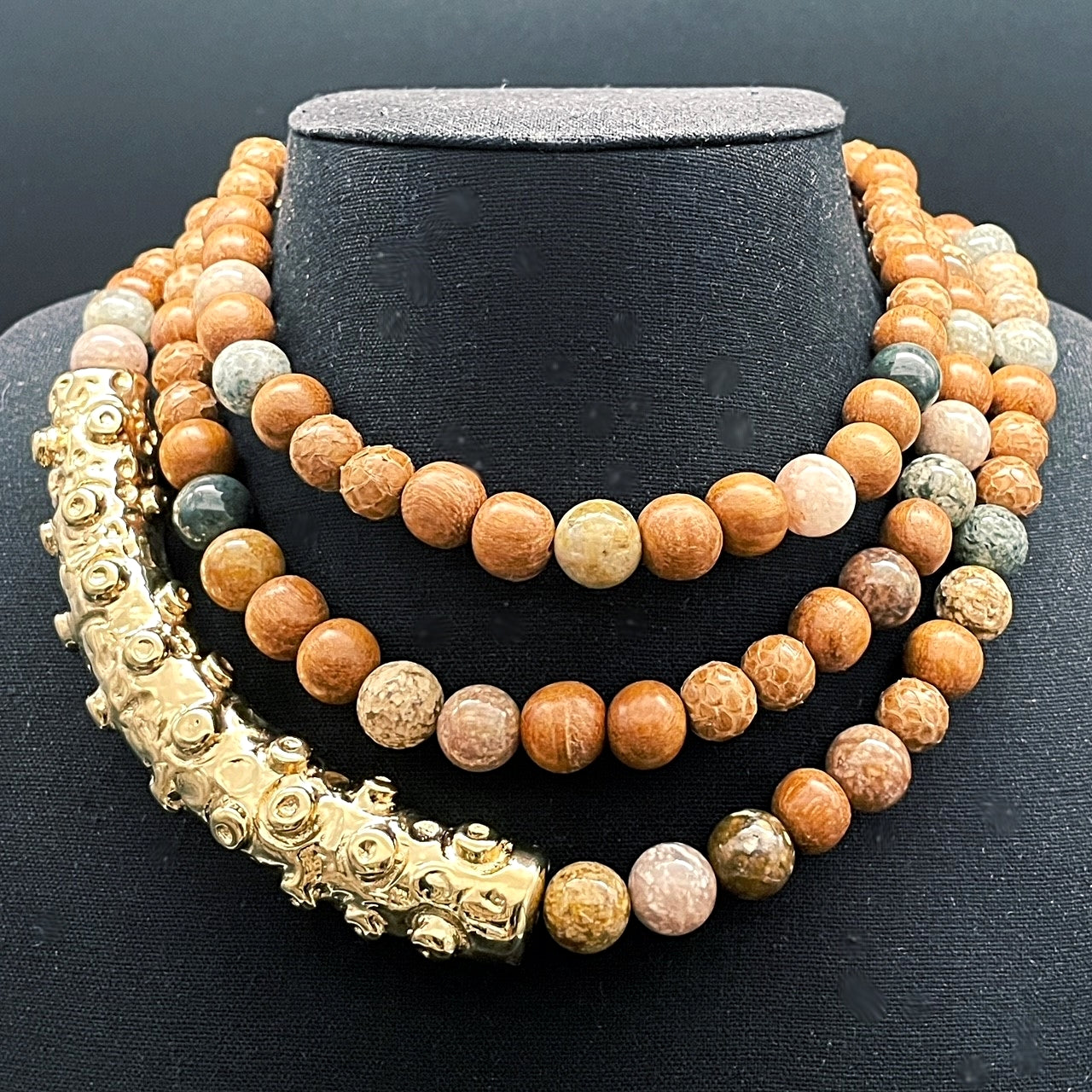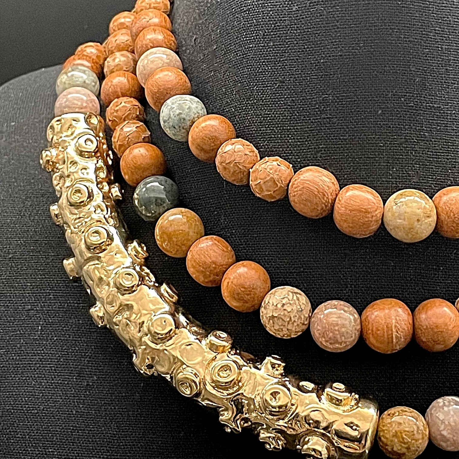 Collana Octopus, girocollo, regolabile in lunghezza. Un elemento asimmetrico in bronzo bianco, a tentacolo di polipo, avvolge perle in Pitone, giada, legno e diaspro. Finitura in oro 18 carati.