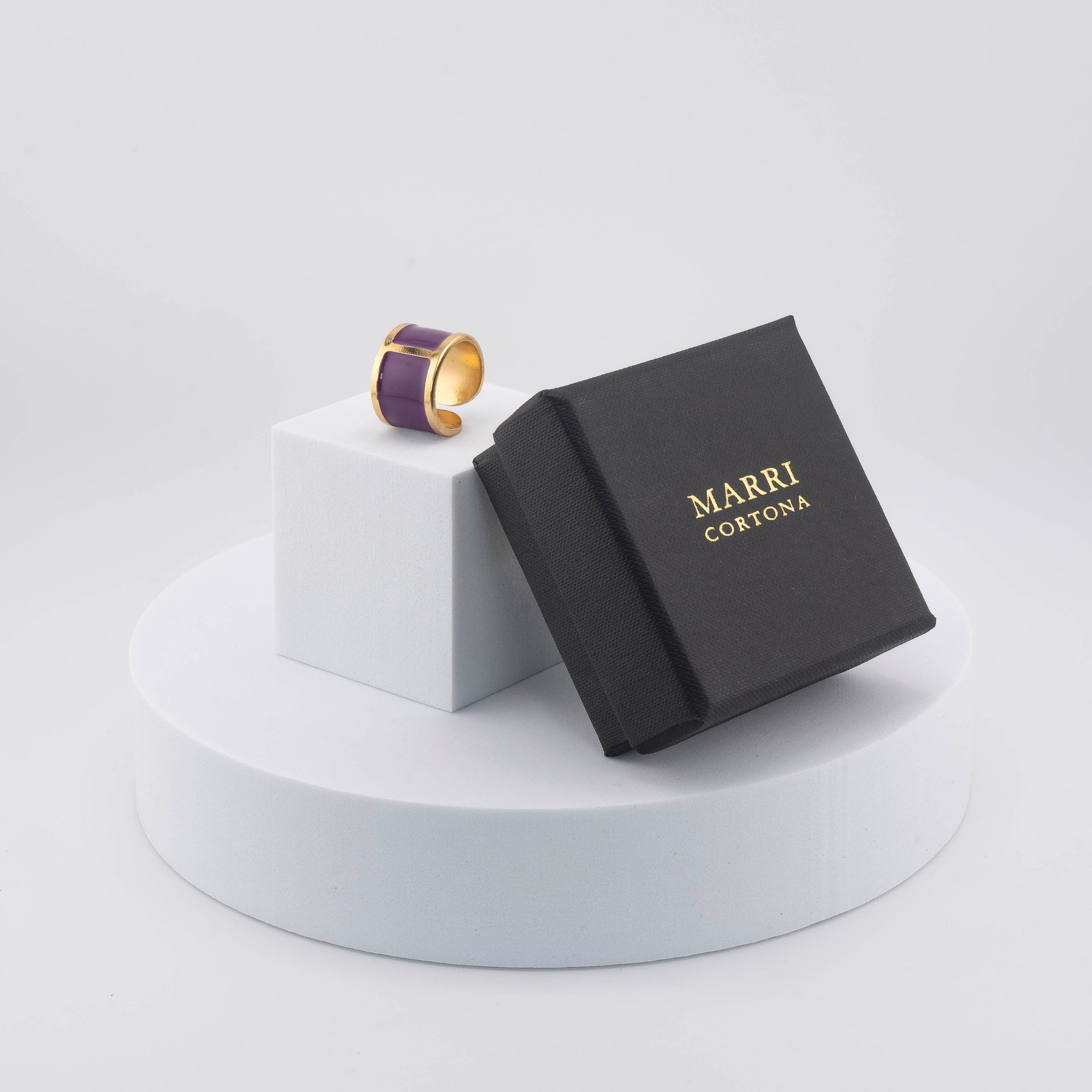 The MarriCortona Smalto Rings are a radiant fusion of light and color, where the brilliance of 18k gold plating meets the vibrant beauty of hand-painted ceramic enamel.