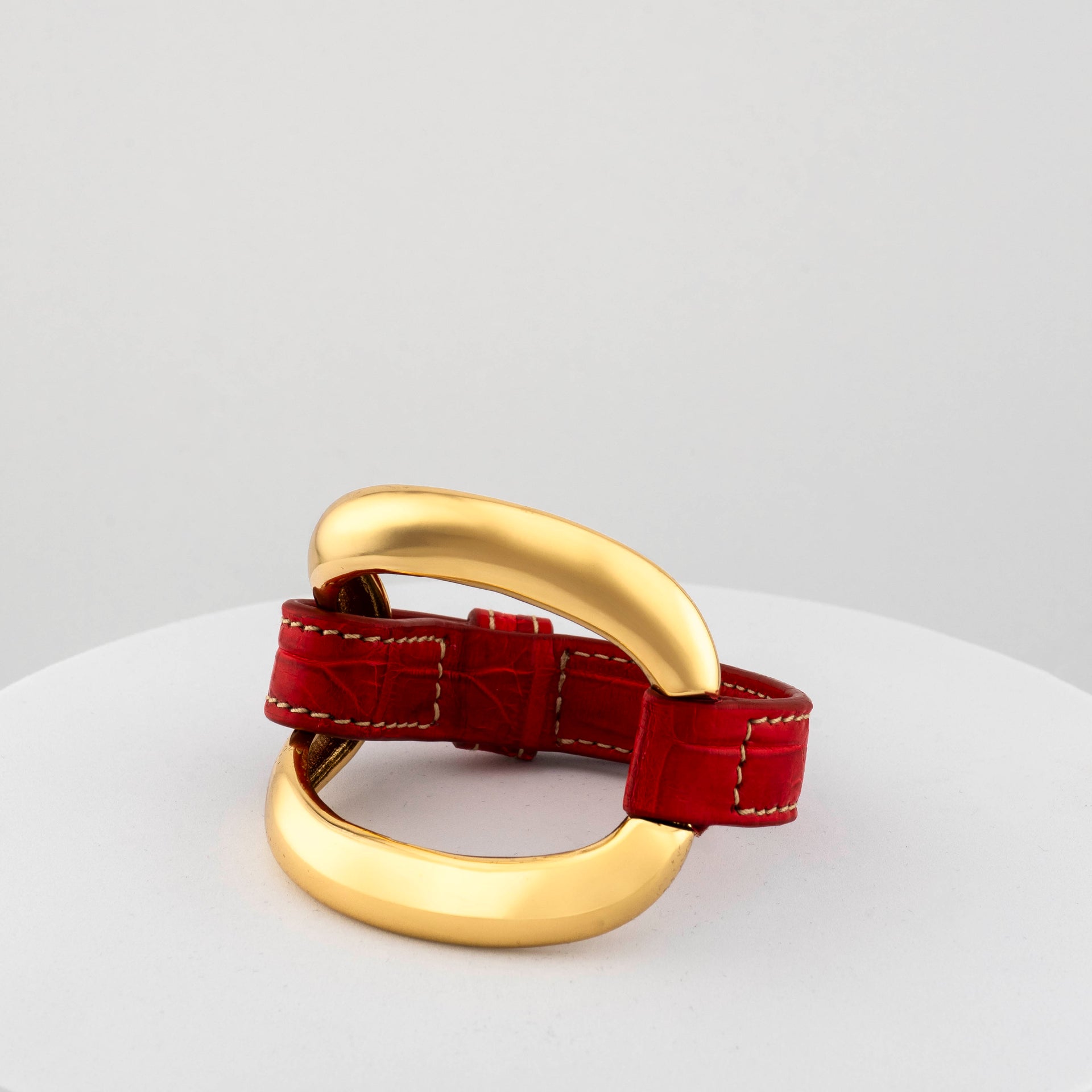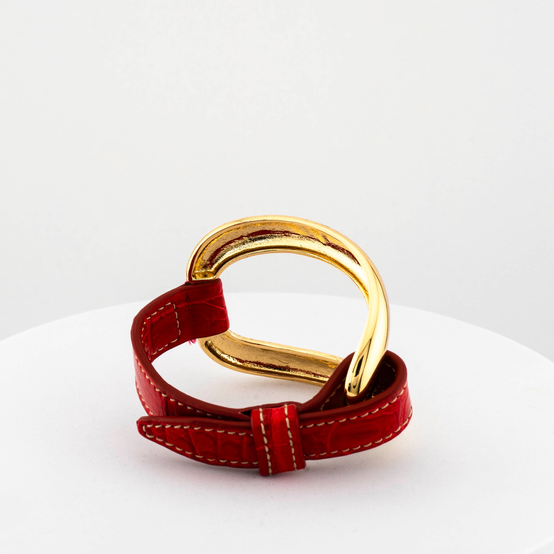 Created through lost-wax bronze casting and finished with 18-carat gold plating, it features an asymmetric elliptical element paired with a hand-stitched genuine crocodile leather strap, making each piece truly unique and unrepeatable.The fusion of precious metal and natural texture gives this bracelet a distinctive, refined presence — perfect for those who seek authenticity and contemporary style rooted in artisanal tradition.