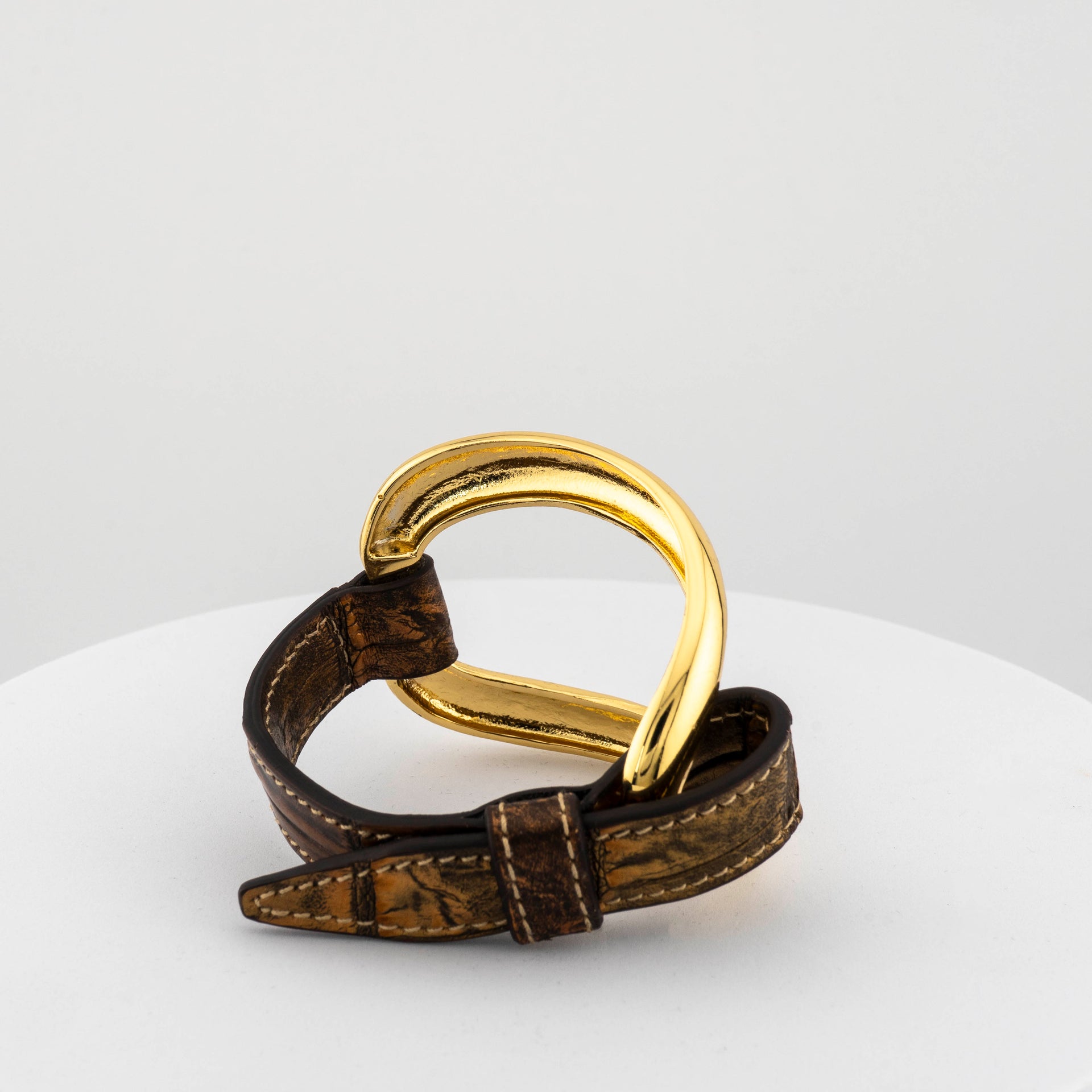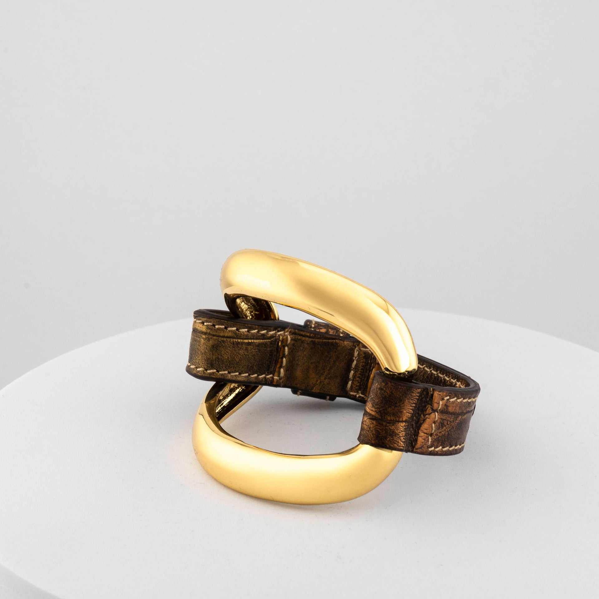 Created through lost-wax bronze casting and finished with 18-carat gold plating, it features an asymmetric elliptical element paired with a hand-stitched genuine crocodile leather strap, making each piece truly unique and unrepeatable.The fusion of precious metal and natural texture gives this bracelet a distinctive, refined presence — perfect for those who seek authenticity and contemporary style rooted in artisanal tradition.