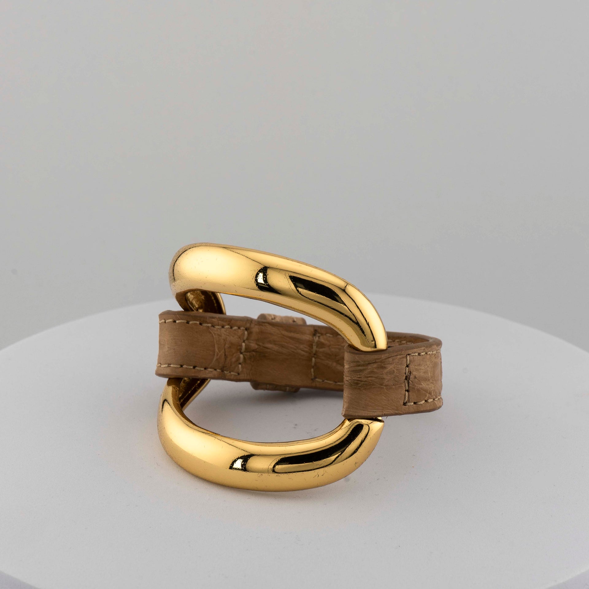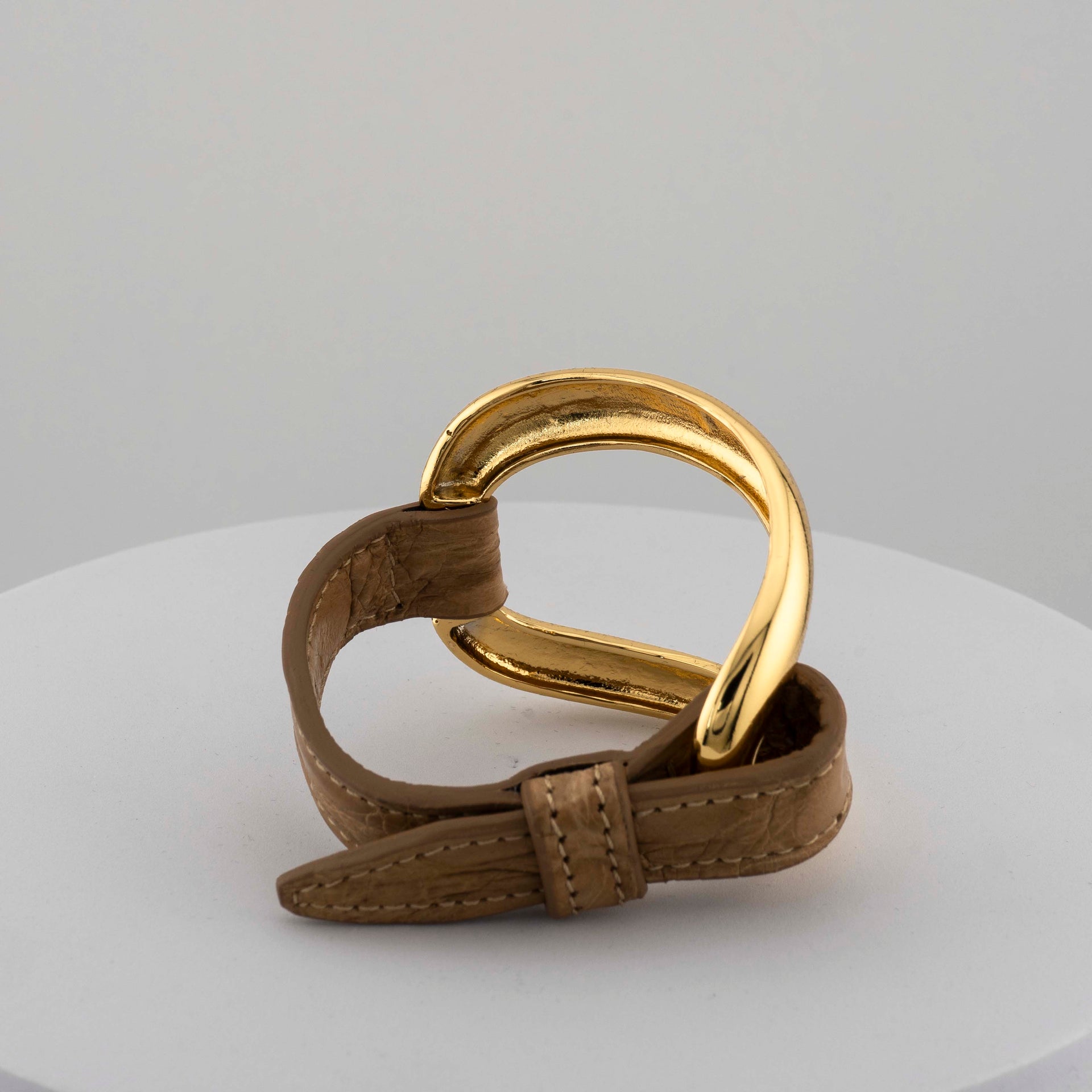 Created through lost-wax bronze casting and finished with 18-carat gold plating, it features an asymmetric elliptical element paired with a hand-stitched genuine crocodile leather strap, making each piece truly unique and unrepeatable.The fusion of precious metal and natural texture gives this bracelet a distinctive, refined presence — perfect for those who seek authenticity and contemporary style rooted in artisanal tradition.