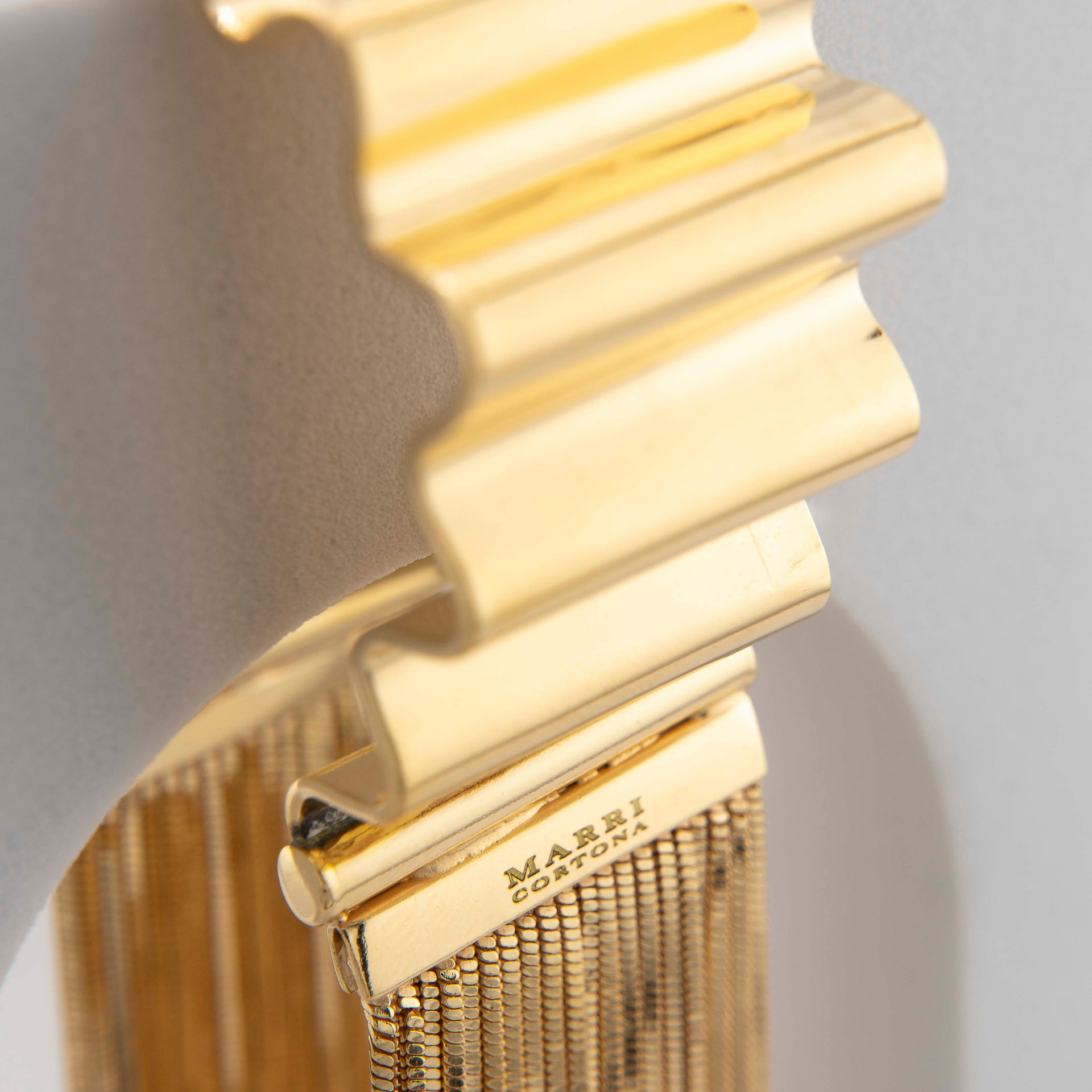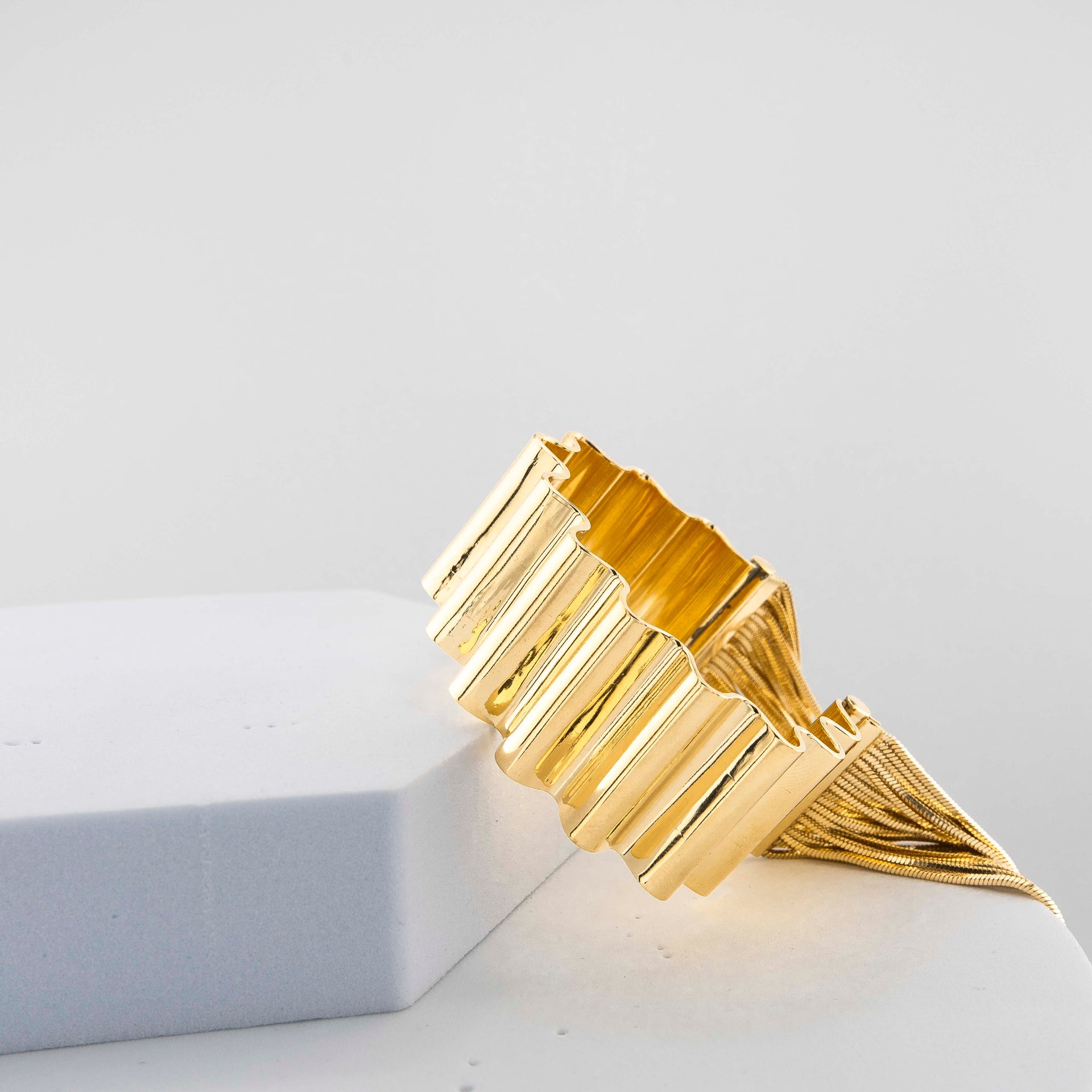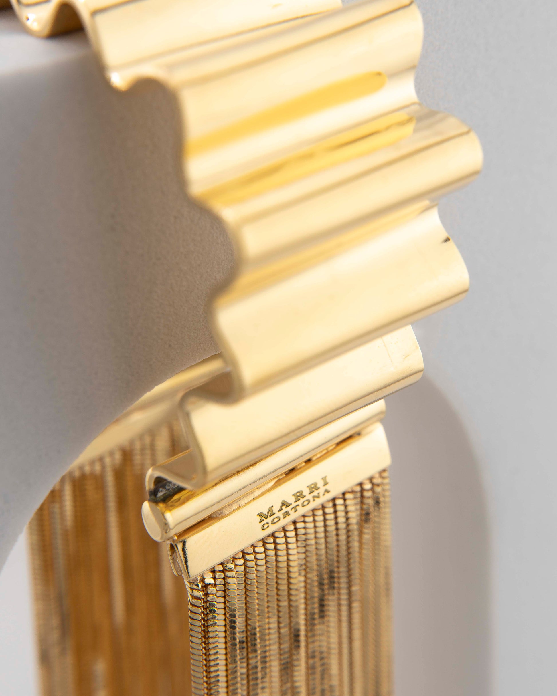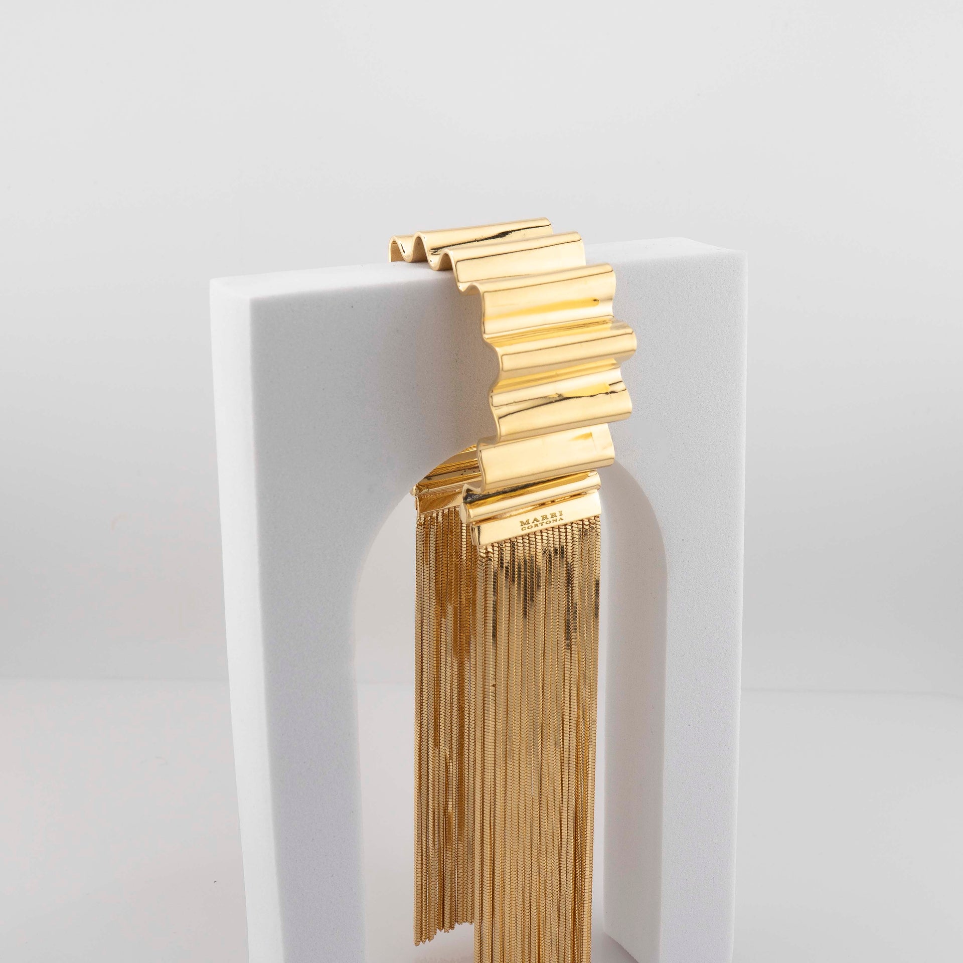 MarriCortona 'Onde'' bracelet in white bronze with fringes, 18-karat gold plating, featuring a sinuous 'wave' motif that captures and reflects light with refined elegance. Along the edge, thin golden fringes extend for 12 cm, sliding lightly like threads of light in motion. With a width of 2.5 cm, this jewel envelops the wrist with a sophisticated and scenographic presence, perfect for those who want an exclusive and luminous accessory. Made in Tuscany, by the expert hands of our craftsmen