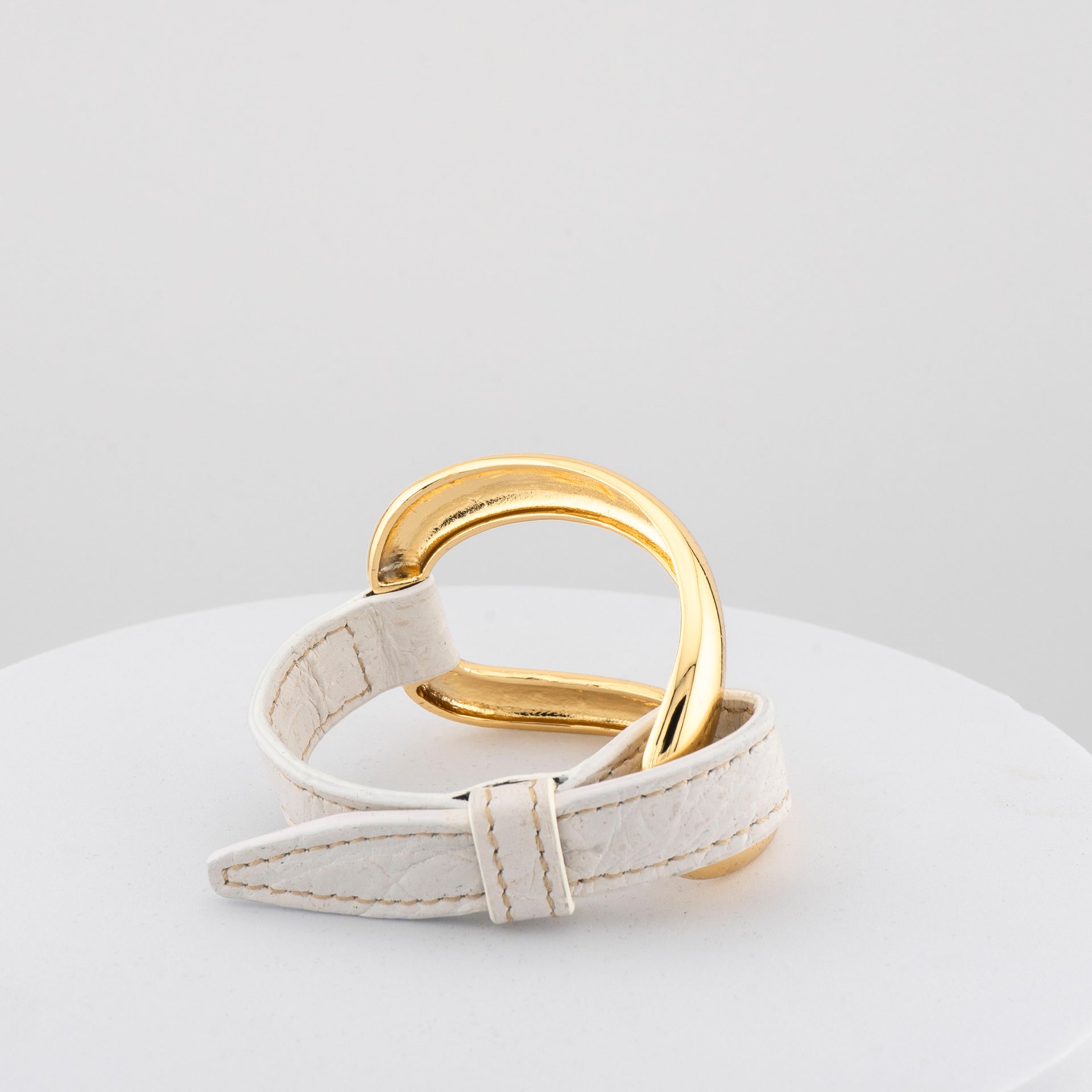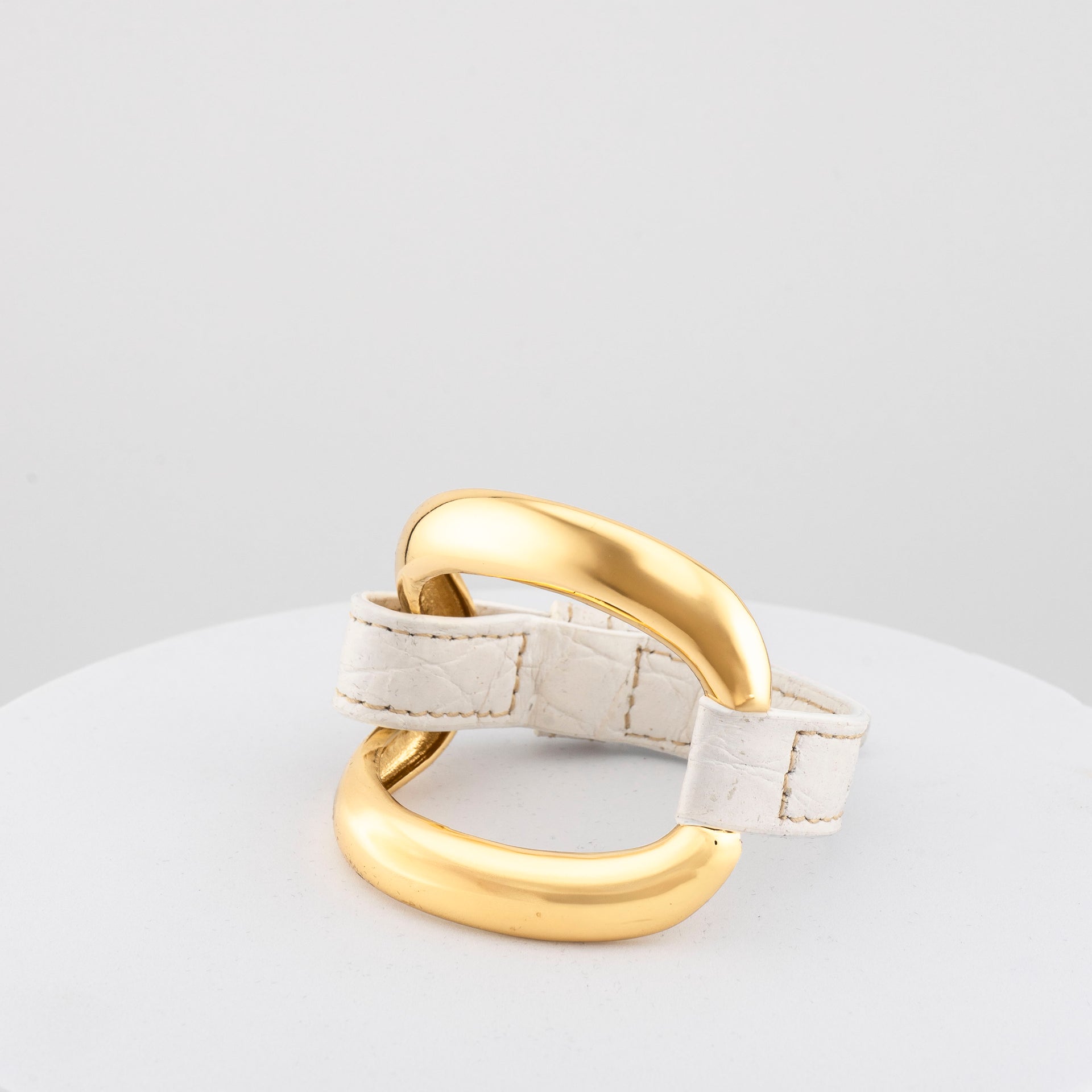 Created through lost-wax bronze casting and finished with 18-carat gold plating, it features an asymmetric elliptical element paired with a hand-stitched genuine crocodile leather strap, making each piece truly unique and unrepeatable.The fusion of precious metal and natural texture gives this bracelet a distinctive, refined presence — perfect for those who seek authenticity and contemporary style rooted in artisanal tradition.