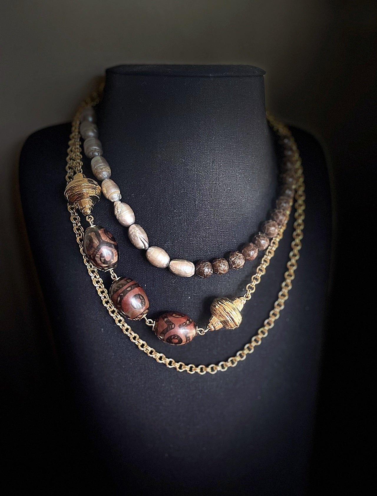 The vintage Uzbek Marri Cortona "Murrine" necklace in glass paste, brown python, giant oval natural gray pearls, unique piece