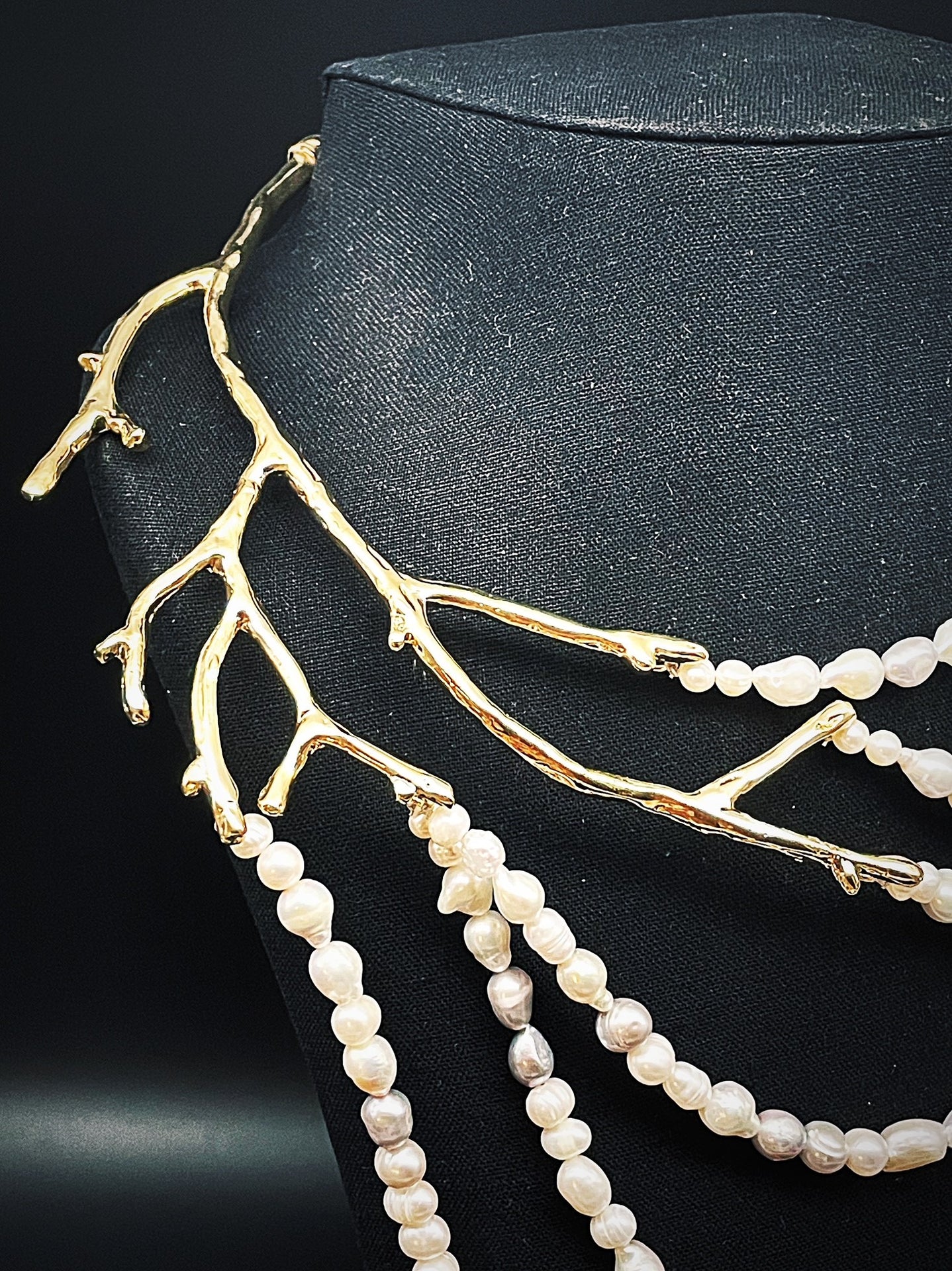 'Ramo' choker necklace, Marri Cortona, adjustable in length. An asymmetrical bronze coral branch element envelops natural, pinkish white cultured pearls. 18k gold finish.