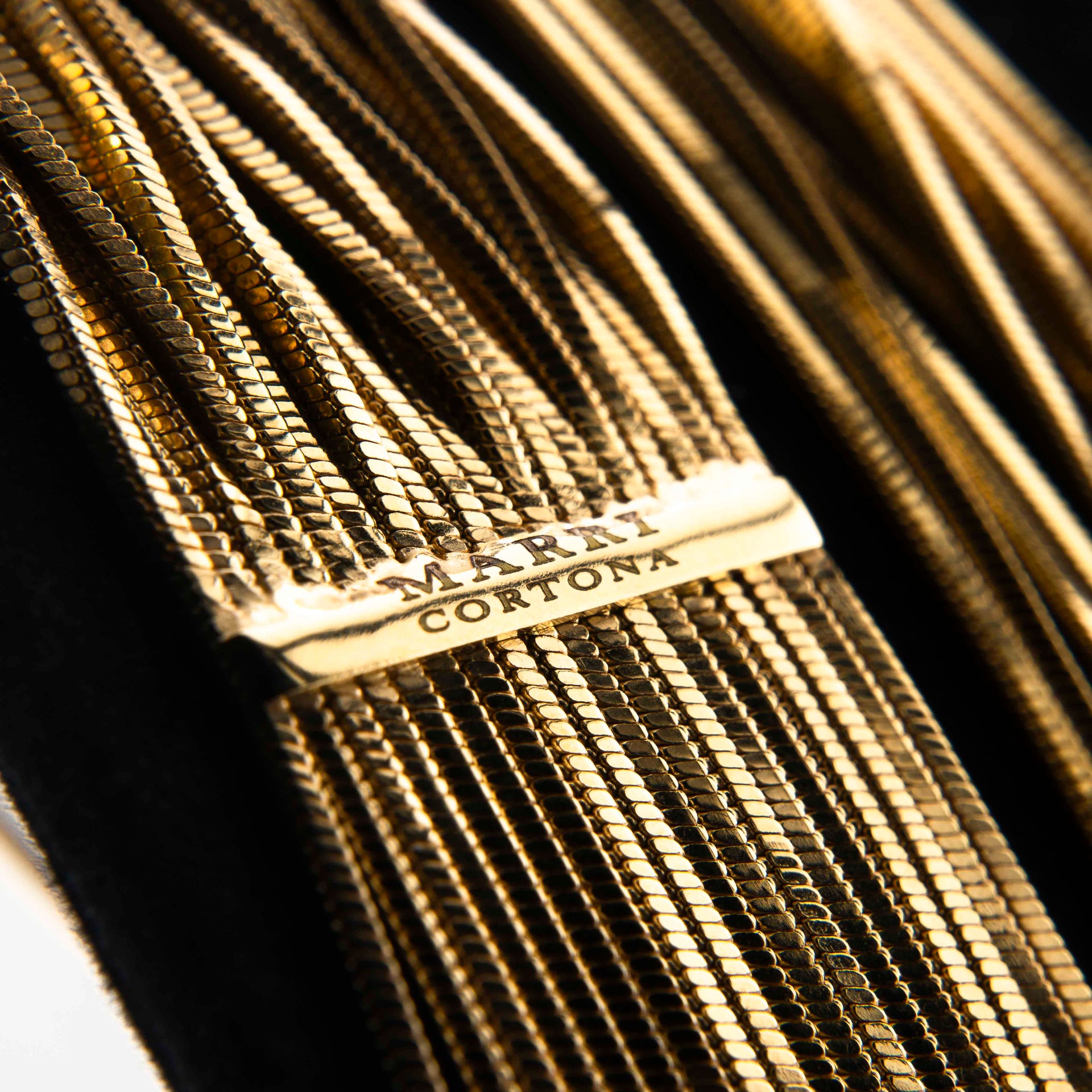 Made of bronze with 18k gold plating, it features twenty-three compact strands that reflect the light with a luminous, sophisticated effect, elevating any look with effortless elegance.