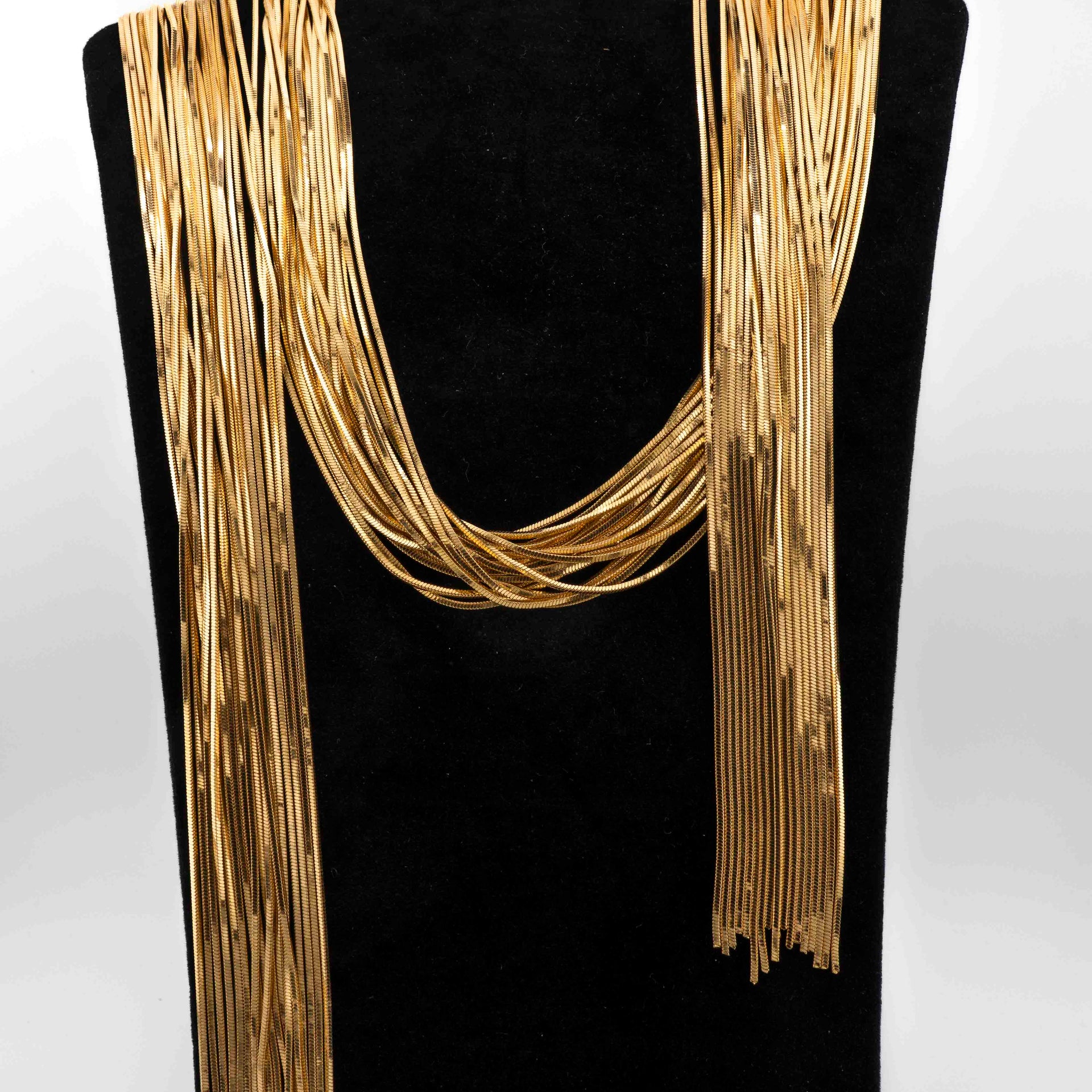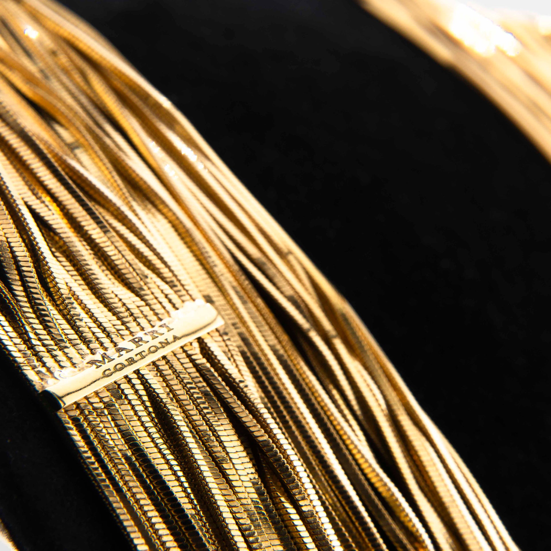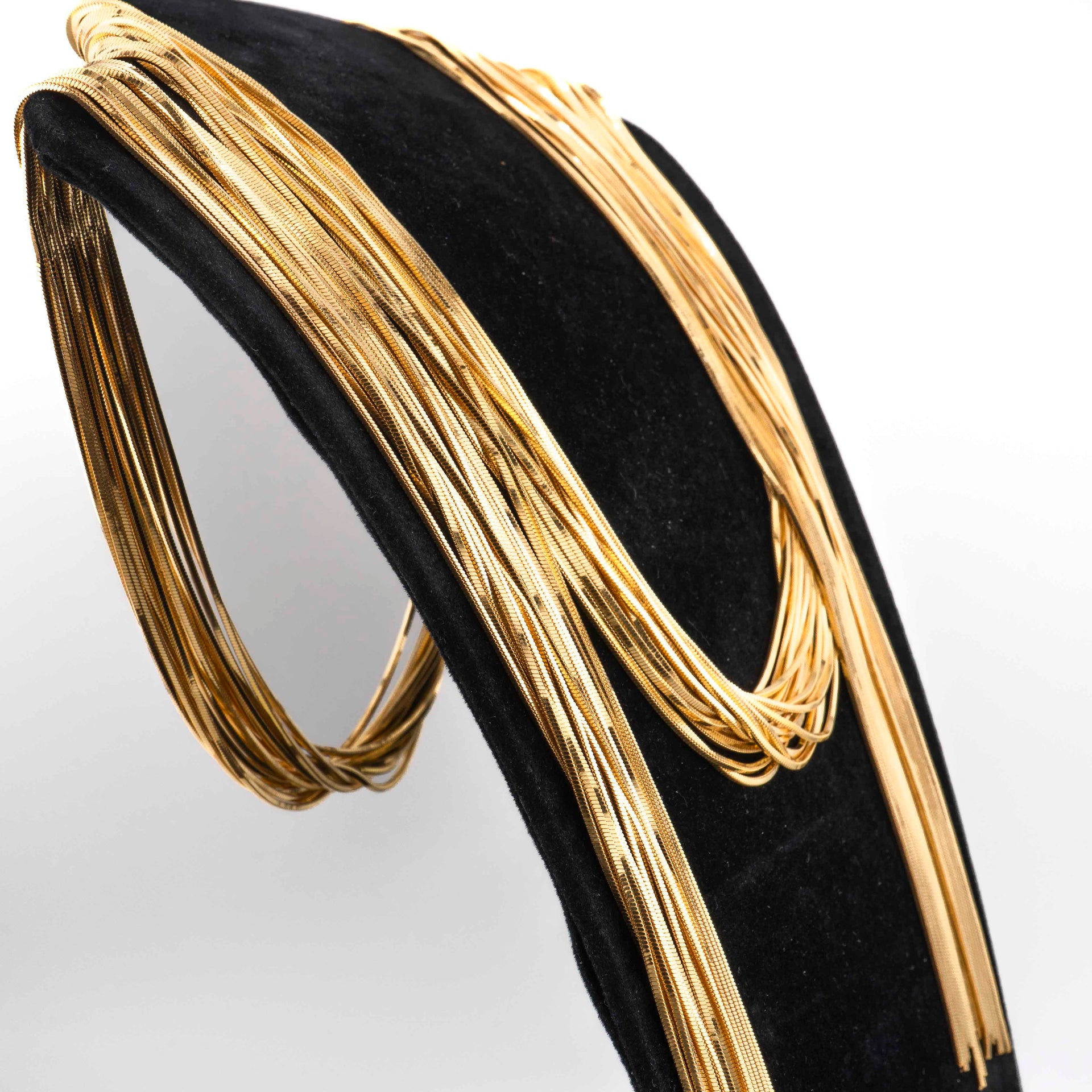 Made of bronze with 18k gold plating, it features twenty-three compact strands that reflect the light with a luminous, sophisticated effect, elevating any look with effortless elegance.