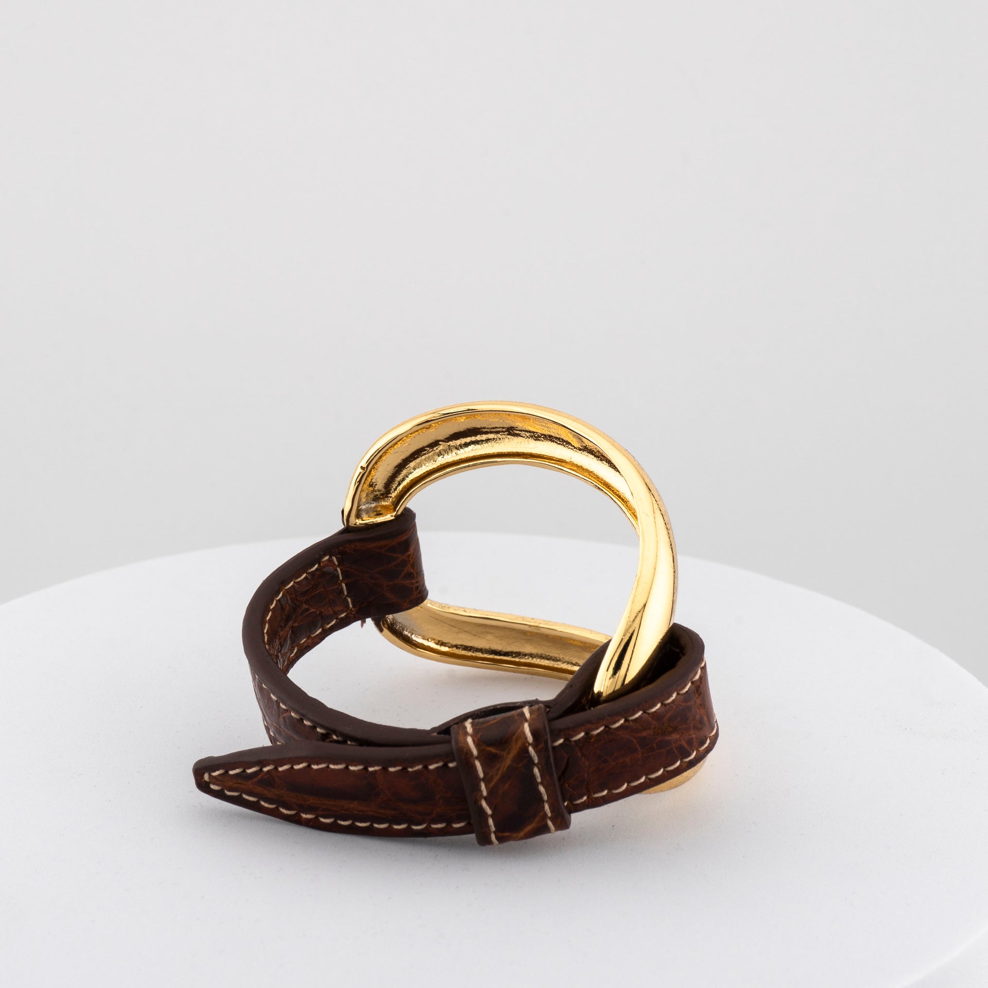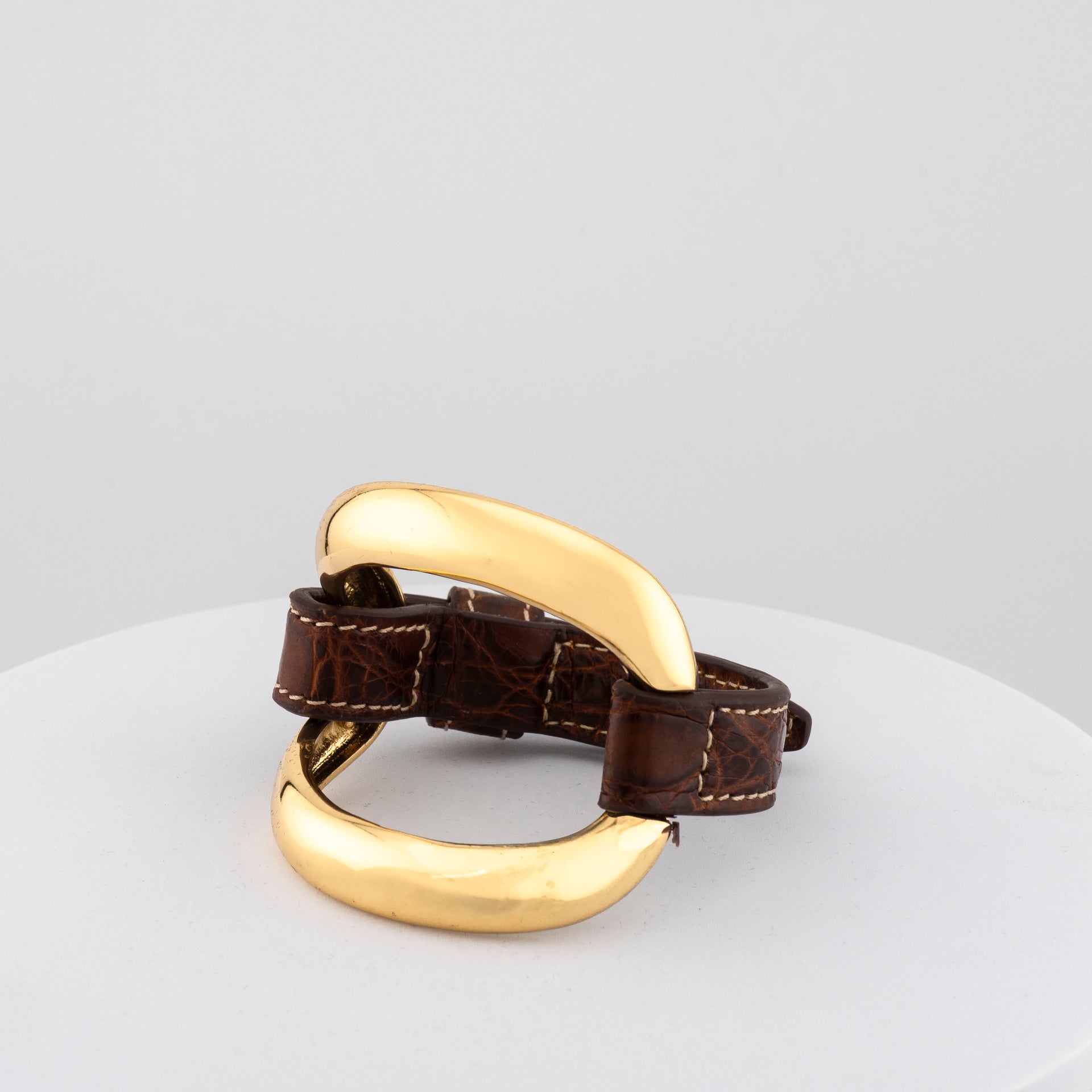 Created through lost-wax bronze casting and finished with 18-carat gold plating, it features an asymmetric elliptical element paired with a hand-stitched genuine crocodile leather strap, making each piece truly unique and unrepeatable.The fusion of precious metal and natural texture gives this bracelet a distinctive, refined presence — perfect for those who seek authenticity and contemporary style rooted in artisanal tradition.