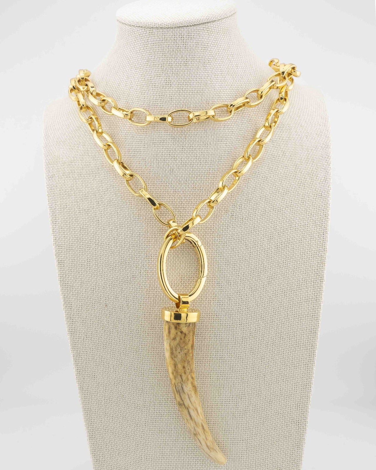 The MarriCortona Deer Antler Necklace is crafted from white bronze with an 18-karat gold plating. The pendant features a deer antler tip. Deer antlers express the constant renewal of life; they fall off annually and grow back with new branches, symbolizing rebirth, increased strength, experience, and age. Unique textures and natural colors range from white to brown, through gray. Handmade in Tuscany.
