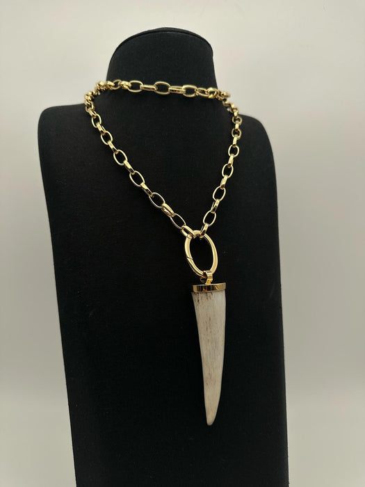 The MarriCortona Deer Antler Necklace is crafted from white bronze with an 18-karat gold plating. The pendant features a deer antler tip. Deer antlers express the constant renewal of life; they fall off annually and grow back with new branches, symbolizing rebirth, increased strength, experience, and age. Unique textures and natural colors range from white to brown, through gray. Handmade in Tuscany.