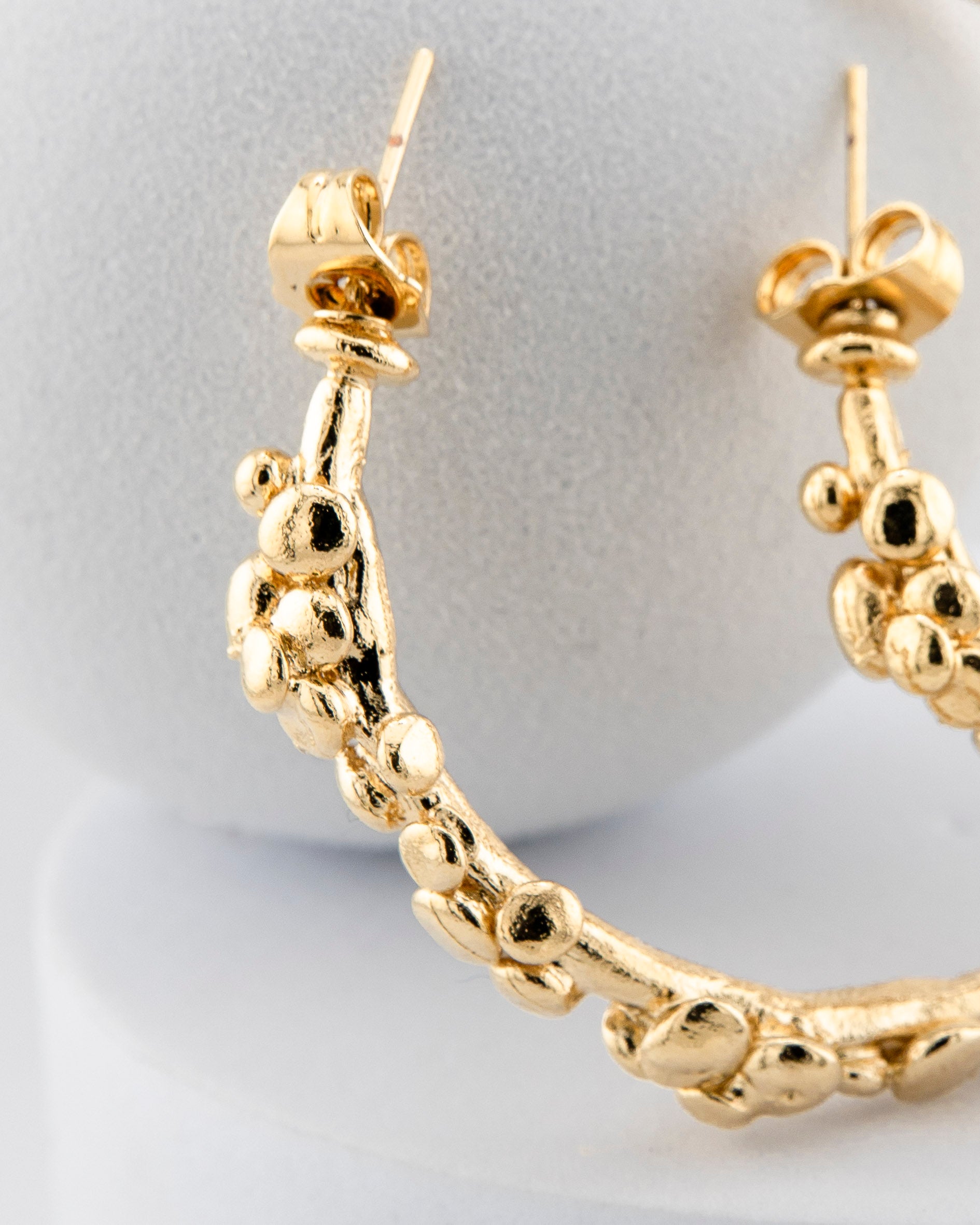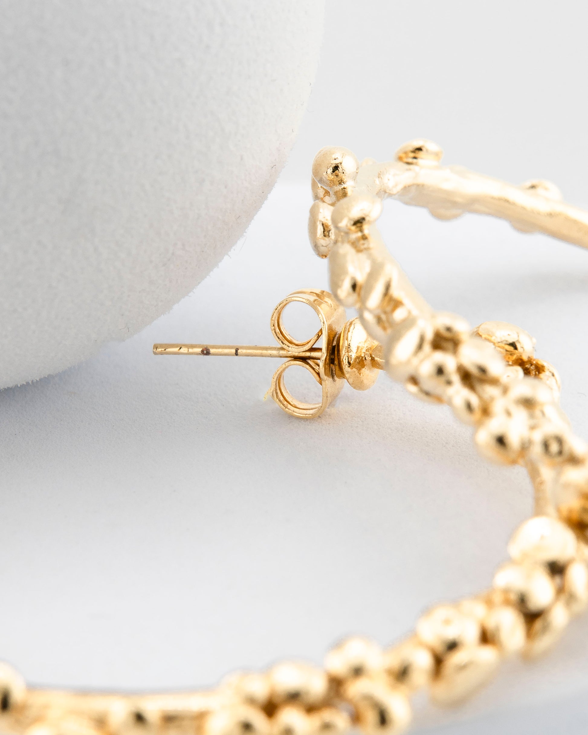 Crafted using the lost-wax casting technique, these 4 cm diameter hoop earrings reinterpret the aesthetic of Etruscan goldsmithing with a light, modern twist. The thin, clean lines enhance the essential shape, while the small granulated appliqués—inspired by the ancient goldsmithing technique—add a touch of artisanal refinement and a sense of local history.
