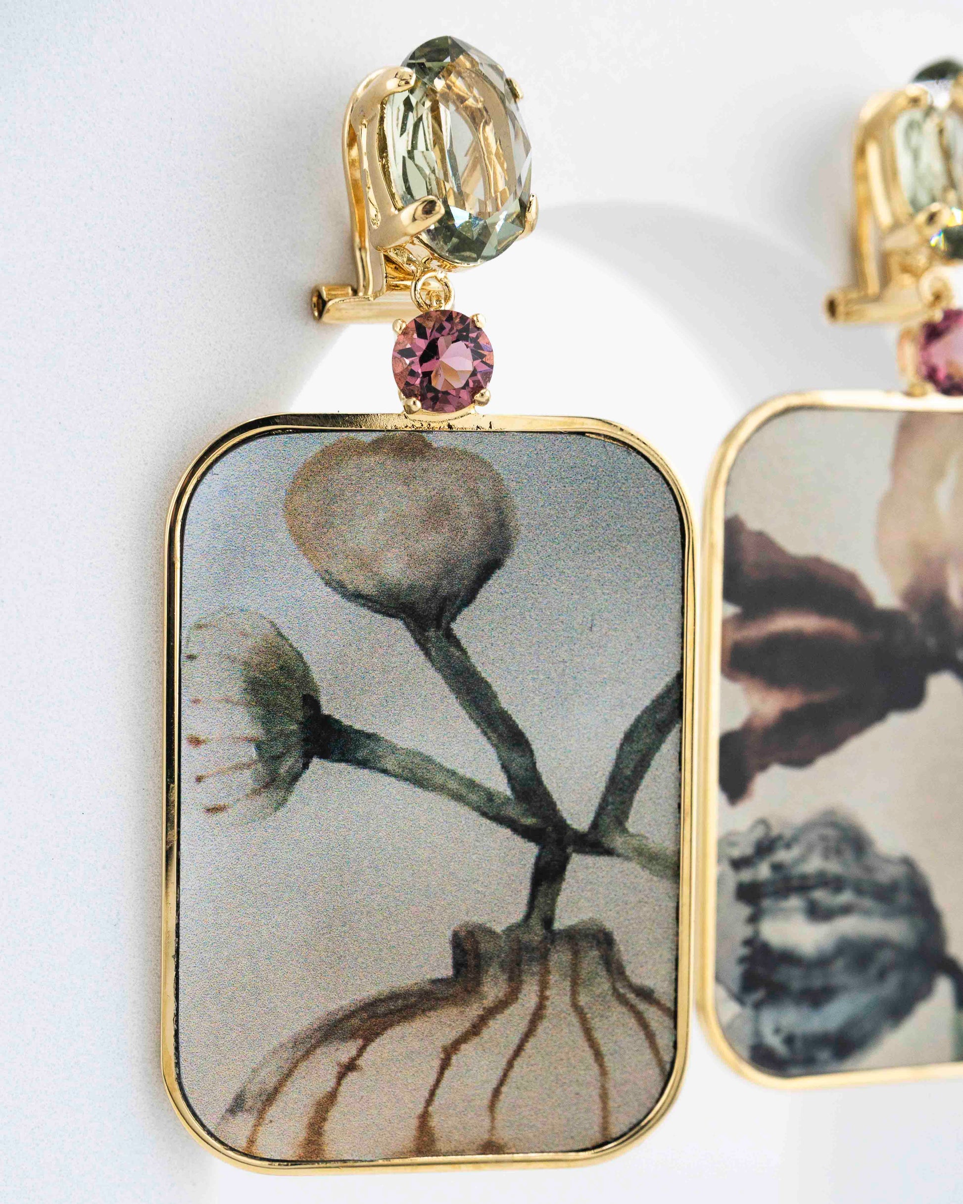 Watercolor comes to life on metal, transforming into a statement yet sophisticated piece. Embellished with Swarovski crystals and finished with 18-karat gold plating, these earrings combine contemporary art and artisanal savoir-faire.