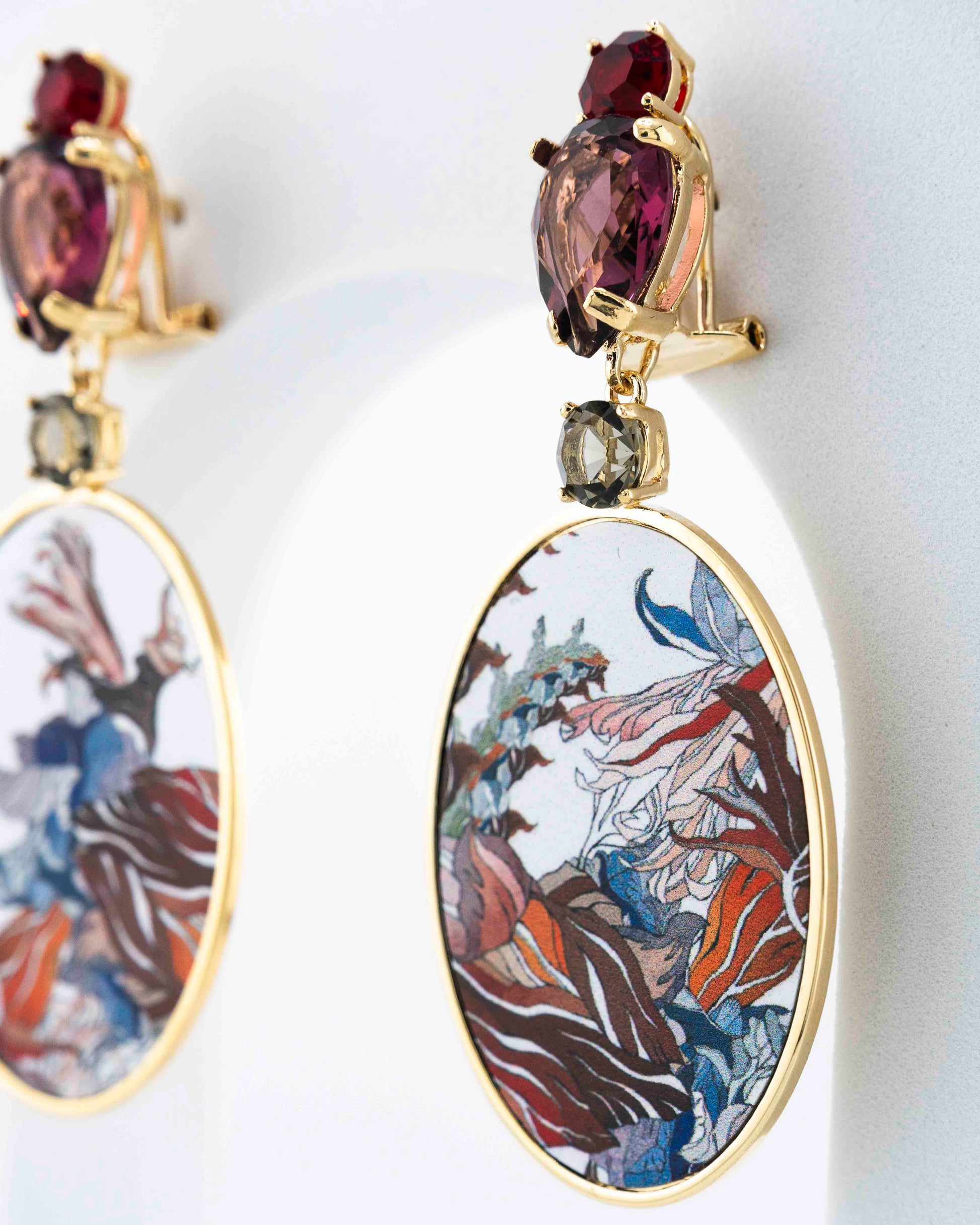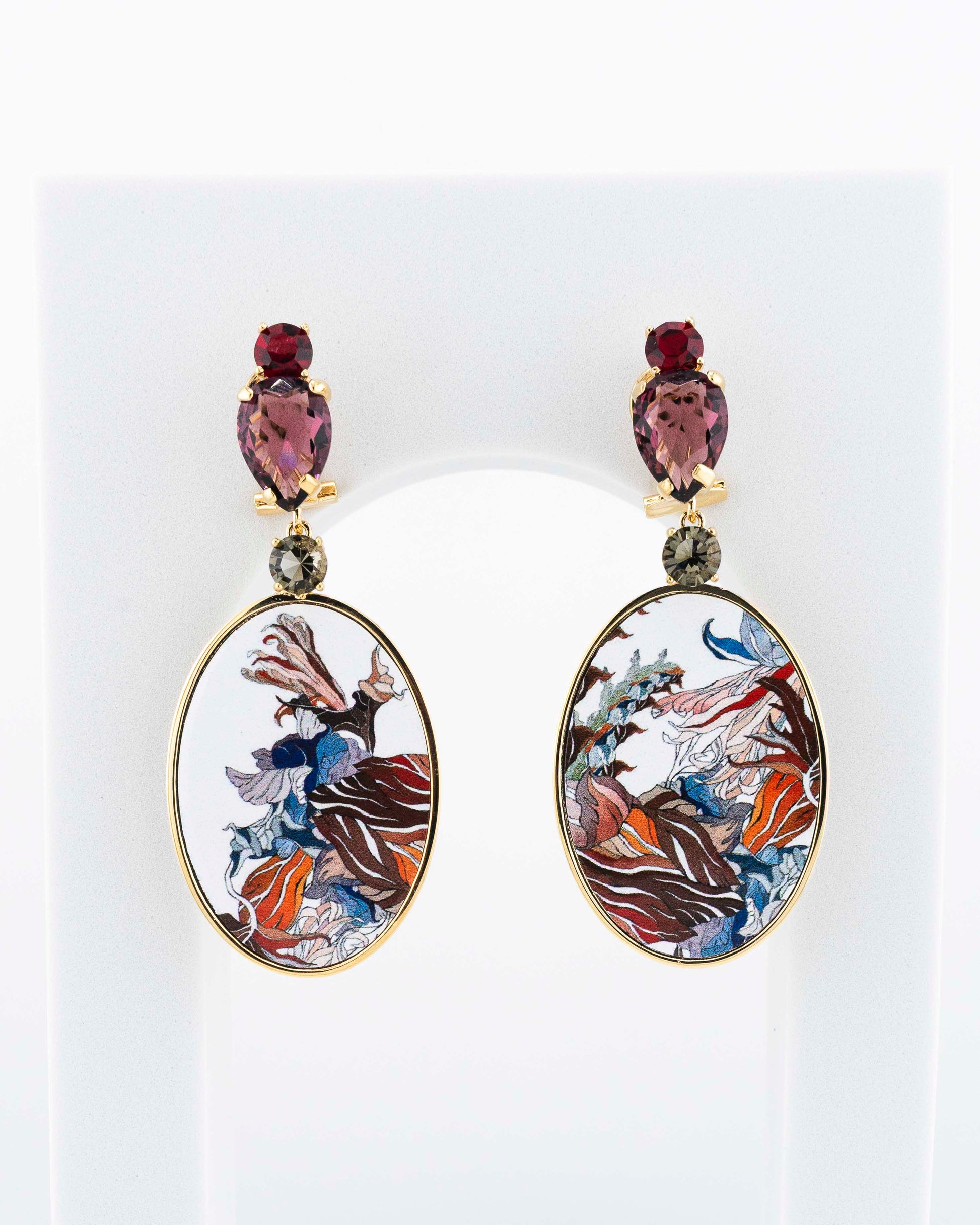 La stampa su metallo esalta il disegno grafico e i contrasti cromatici, trasformando il decoro in un gioiello contemporaneo e di grande personalità. Impreziositi da cristalli Swarovski e rifiniti con placcatura in oro 18 carati, questi orecchini esprimono un’eleganza audace, sofisticata e moderna.