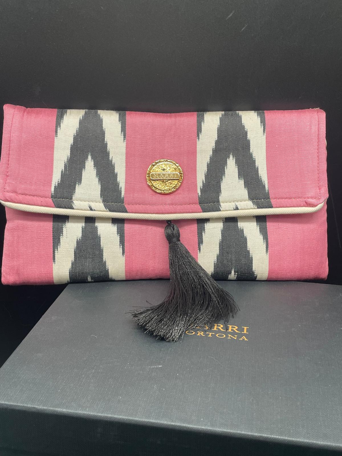La borsa pochette in tessuto Suzani Marri Cortona, 100% seta , foderatura in raso di seta. Grazie al suo design accattivante e all'attenzione per i dettagli, la borsa pochette in tessuto suzani aggiunge un tocco di originalità e colore al tuo outfit, catturando l'attenzione e mostrando il tuo stile unico.