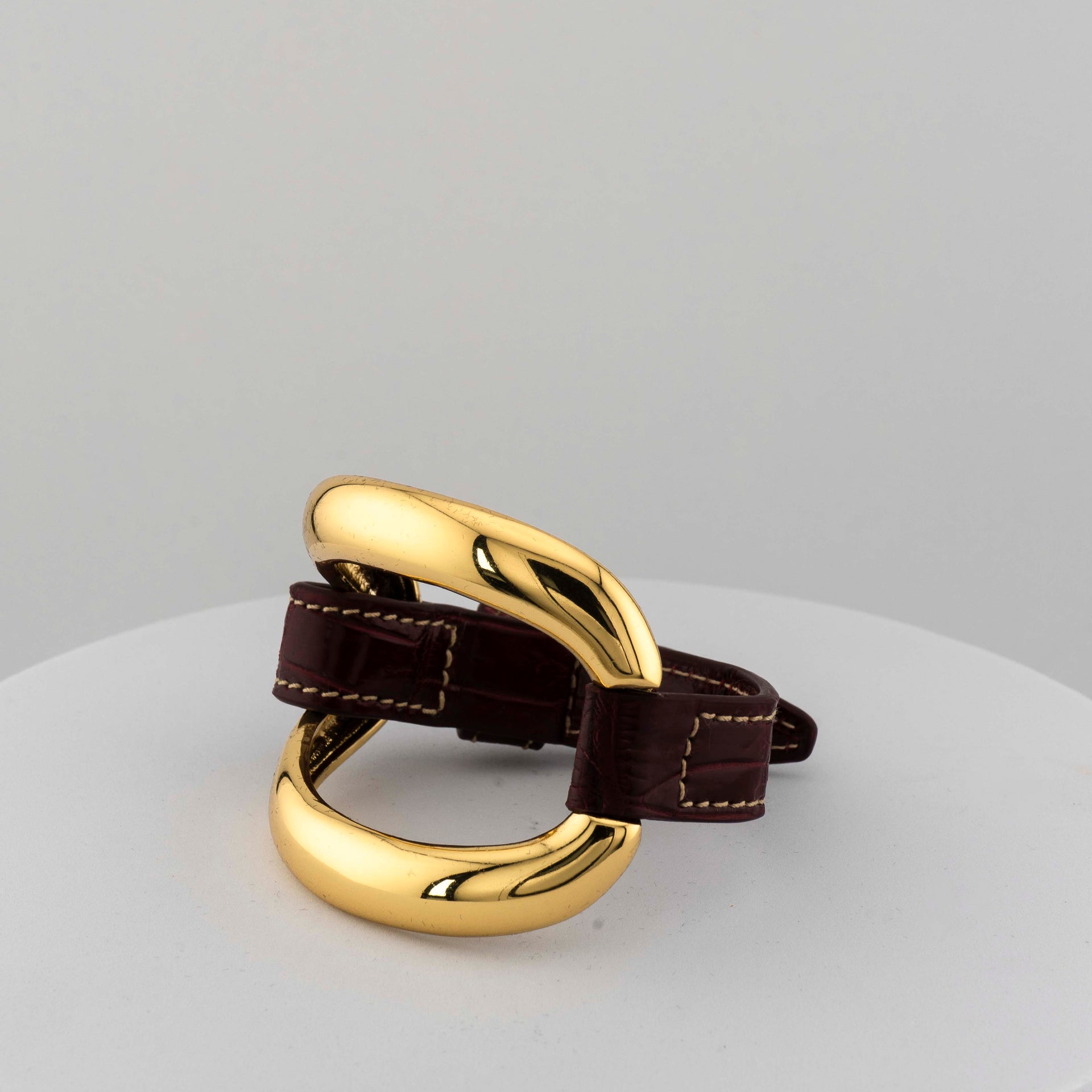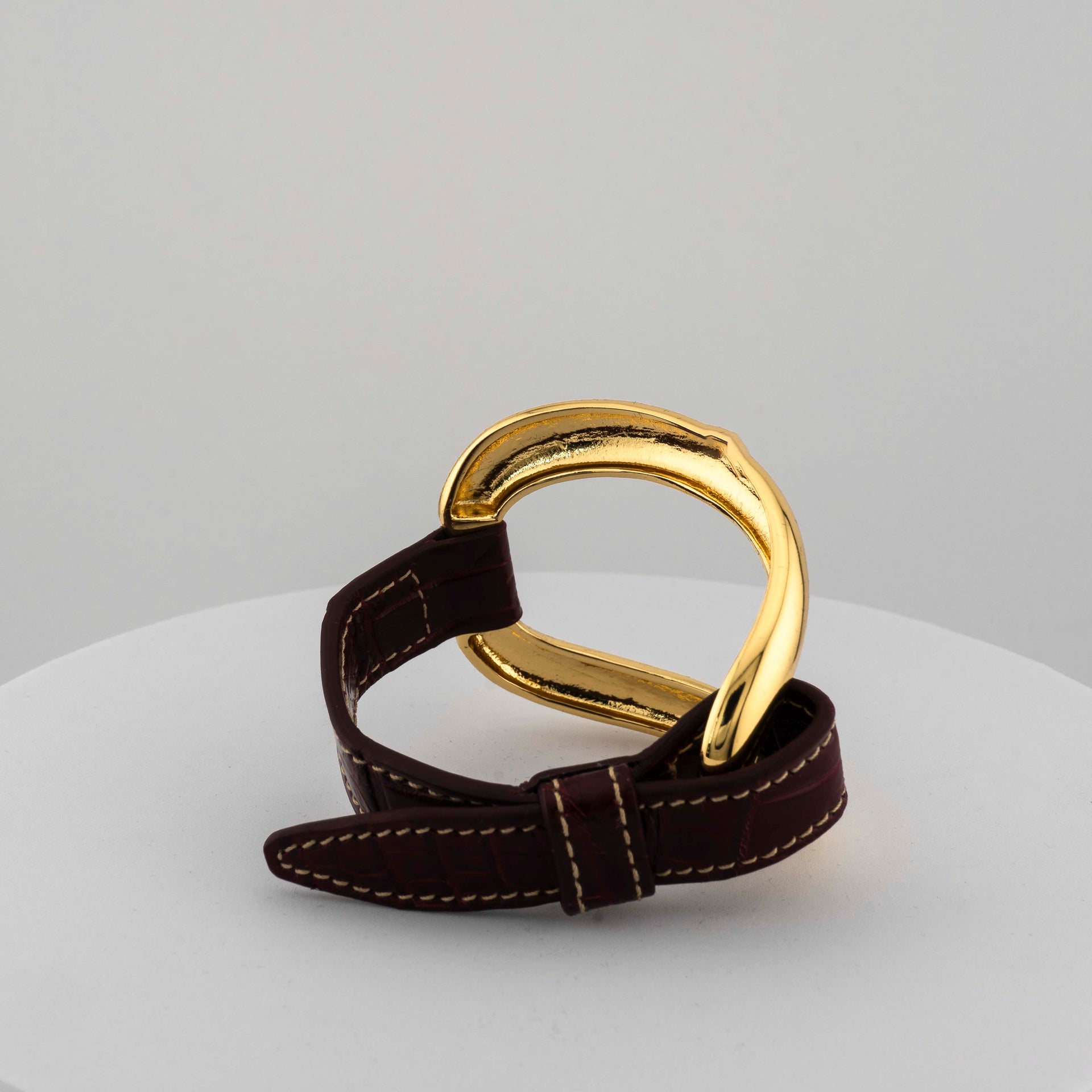 Realizzato in microfusione di bronzo a cera persa, placcato oro 18 carati, presenta un elemento ellittico asimmetrico che dialoga con un cinturino in vera pelle di coccodrillo cucito a mano, rendendo ogni creazione unica e irripetibile.