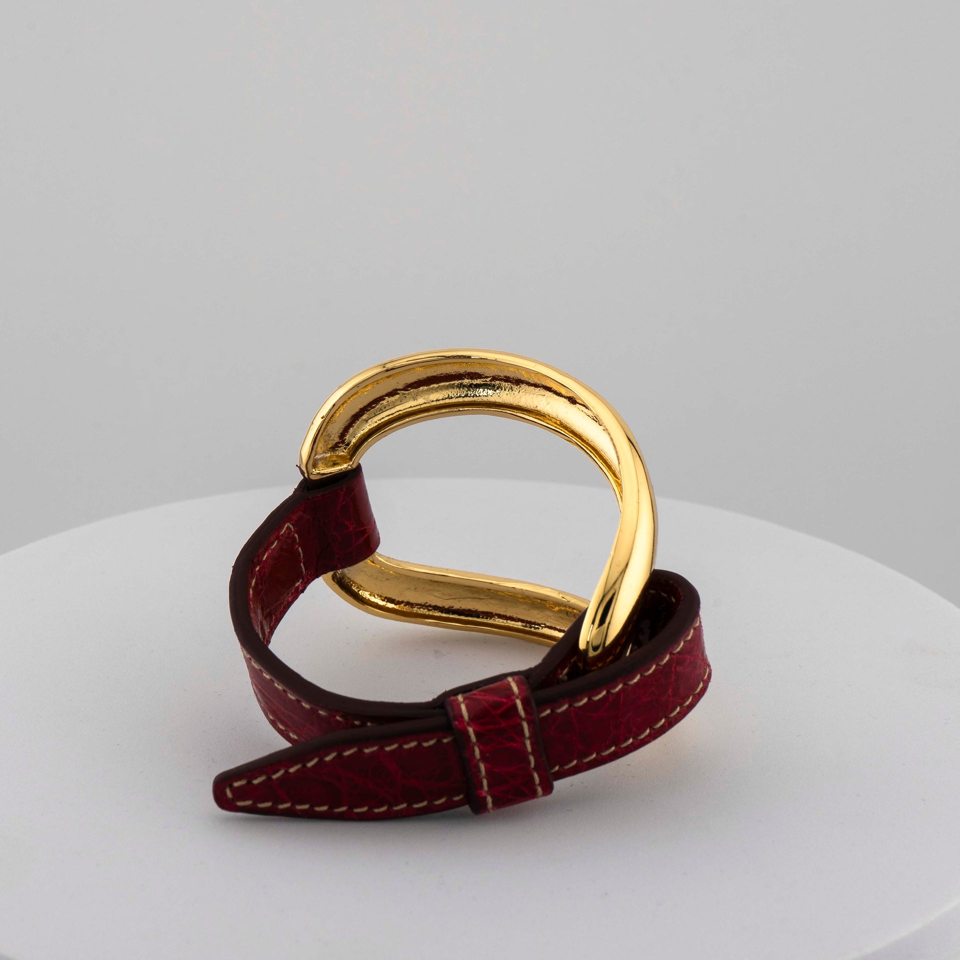 Realizzato in microfusione di bronzo a cera persa, placcato oro 18 carati, presenta un elemento ellittico asimmetrico che dialoga con un cinturino in vera pelle di coccodrillo cucito a mano, rendendo ogni creazione unica e irripetibile.