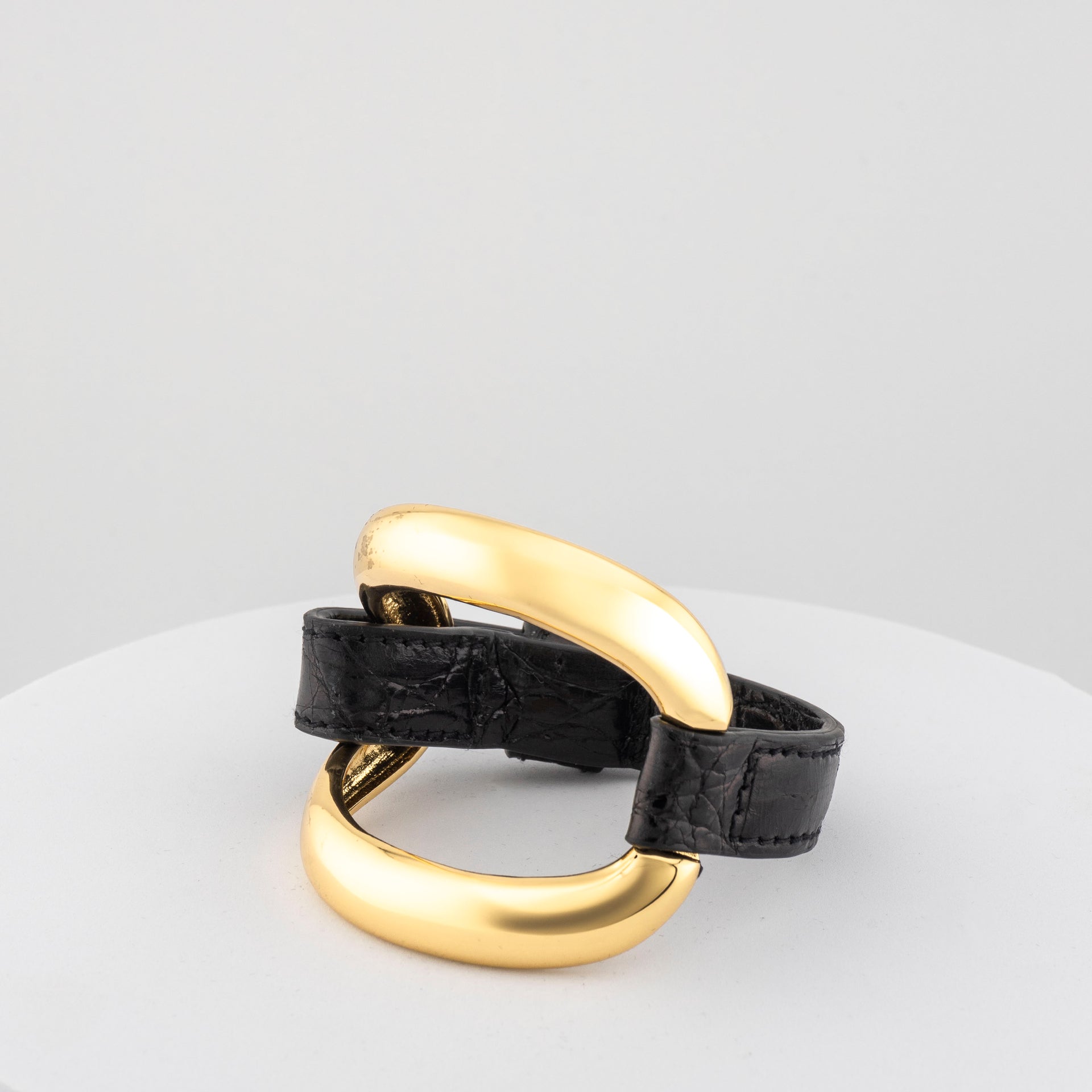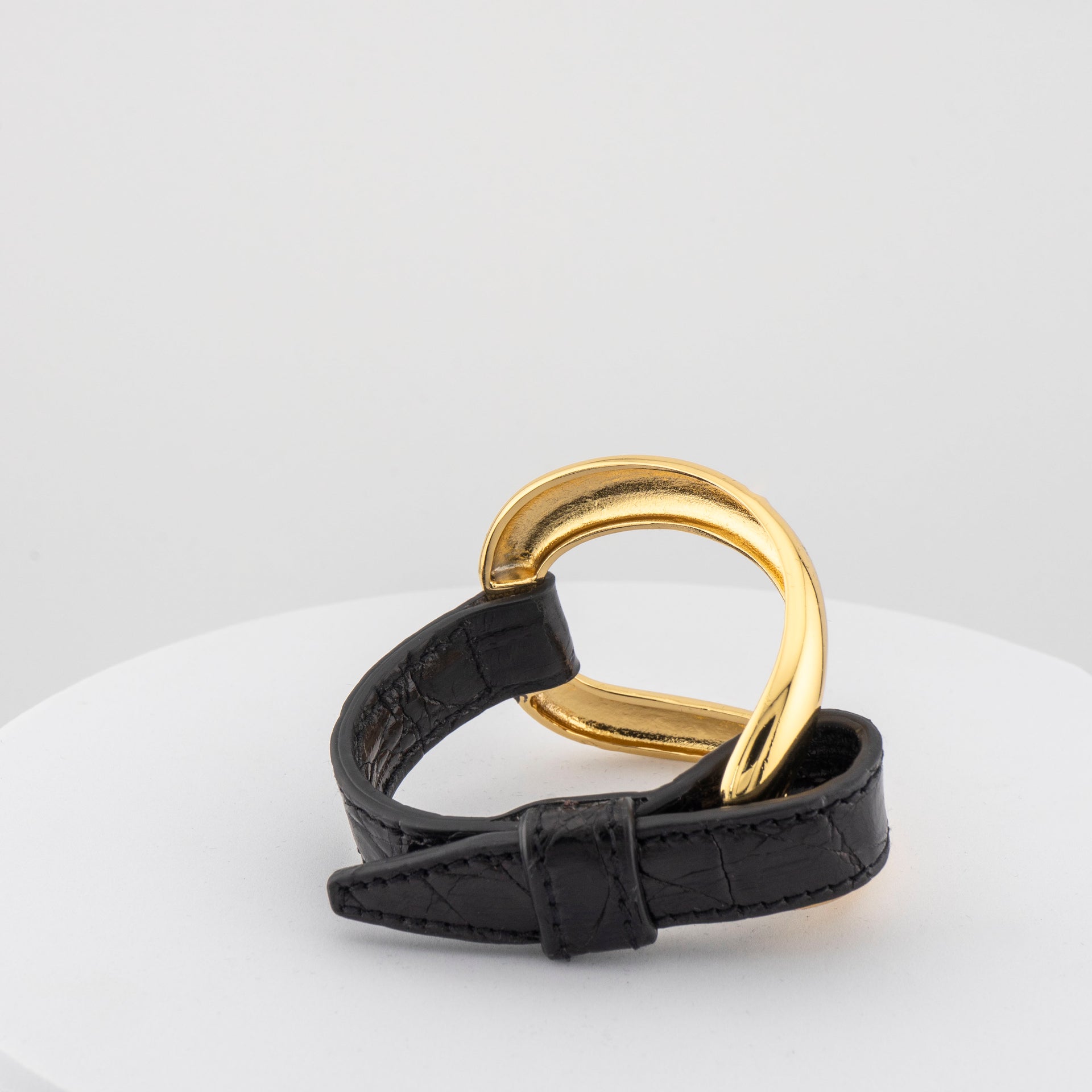 Realizzato in microfusione di bronzo a cera persa, placcato oro 18 carati, presenta un elemento ellittico asimmetrico che dialoga con un cinturino in vera pelle di coccodrillo cucito a mano, rendendo ogni creazione unica e irripetibile.