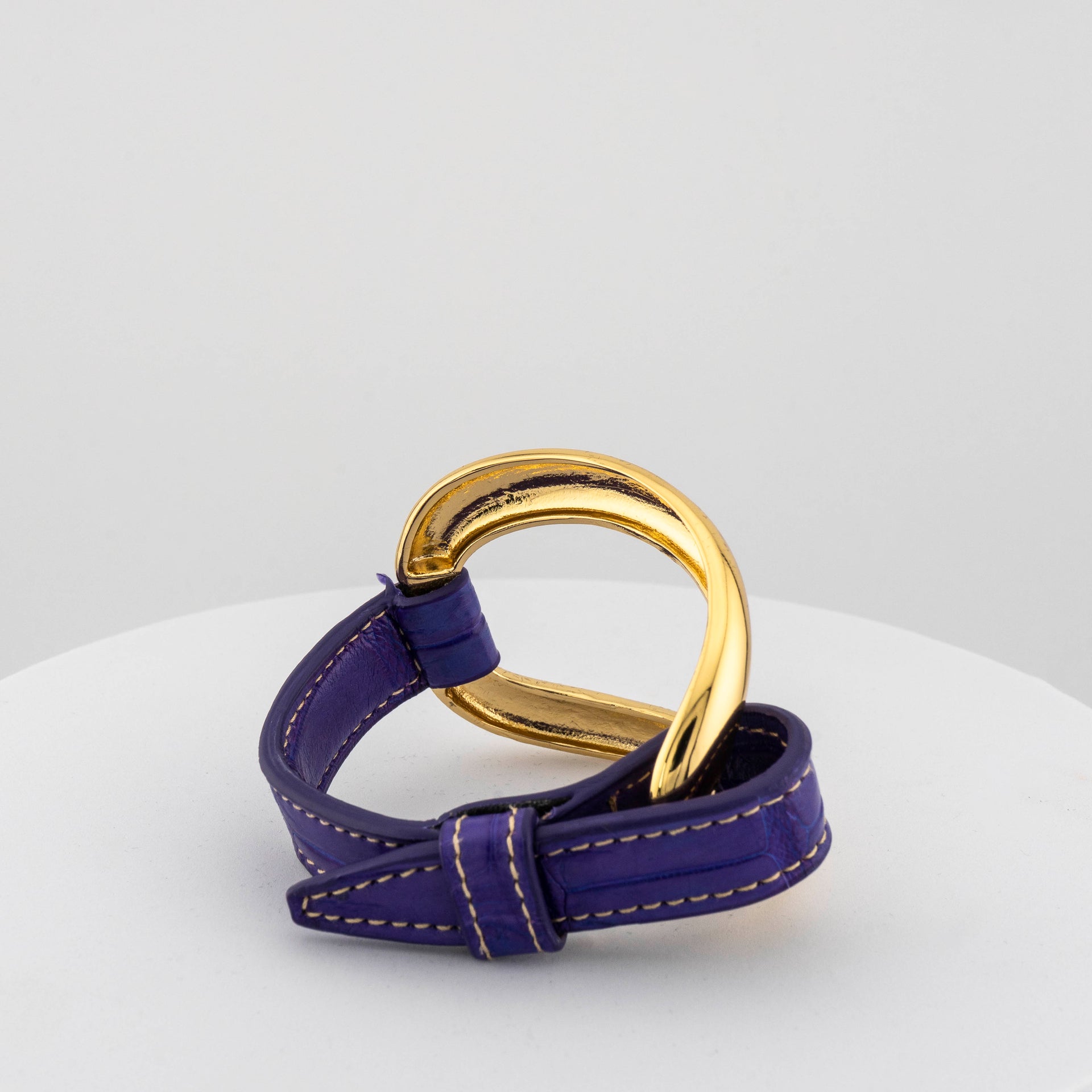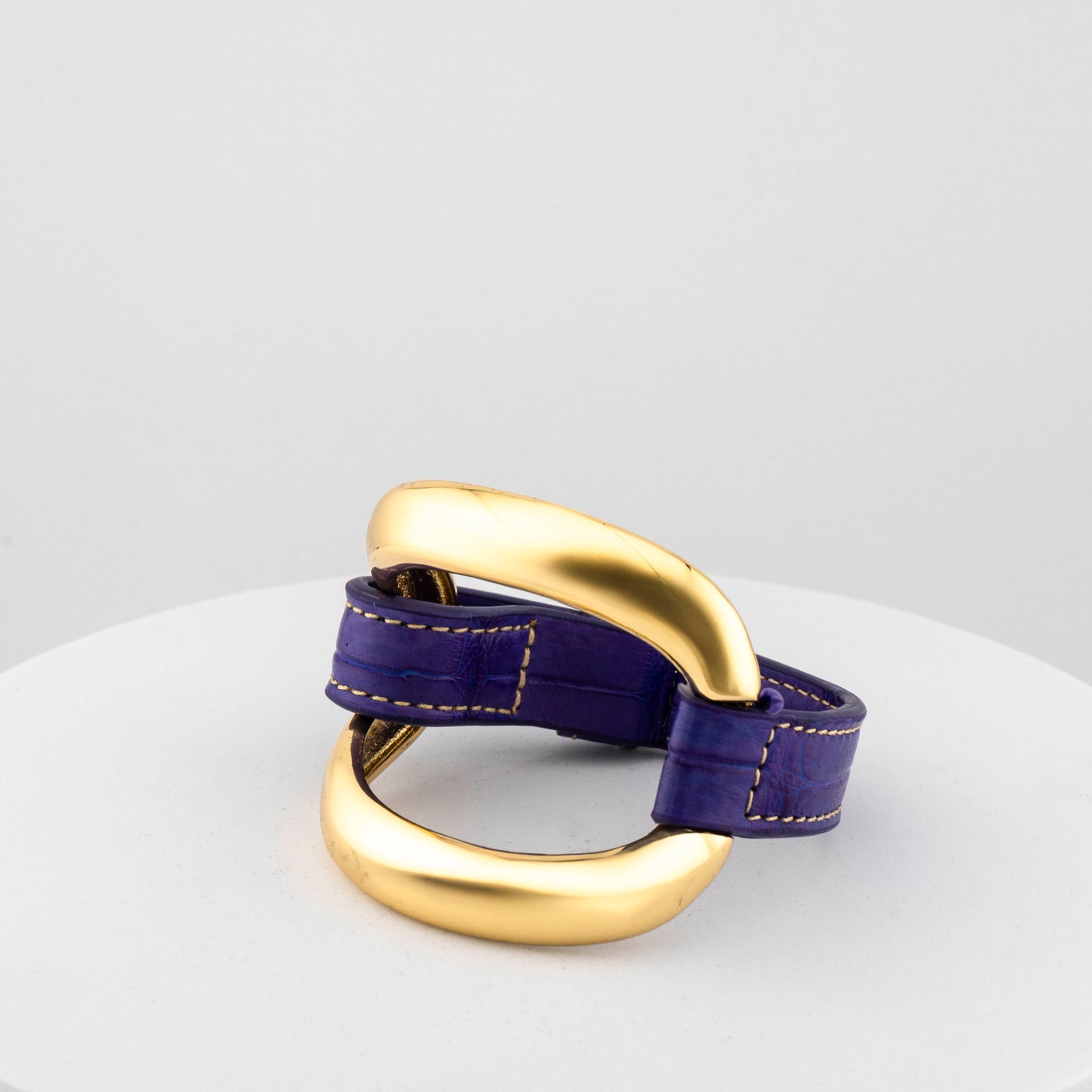 Realizzato in microfusione di bronzo a cera persa, placcato oro 18 carati, presenta un elemento ellittico asimmetrico che dialoga con un cinturino in vera pelle di coccodrillo cucito a mano, rendendo ogni creazione unica e irripetibile.
