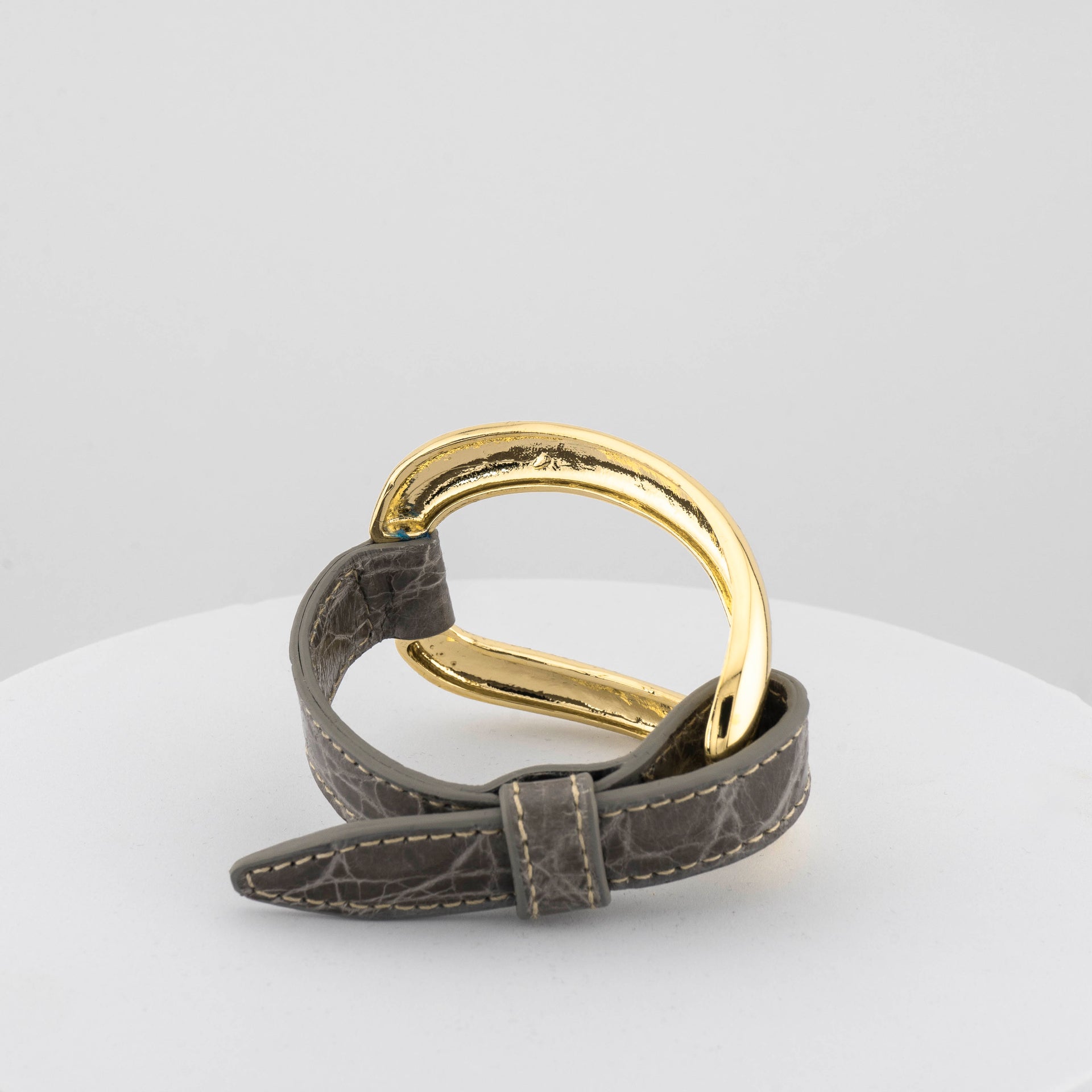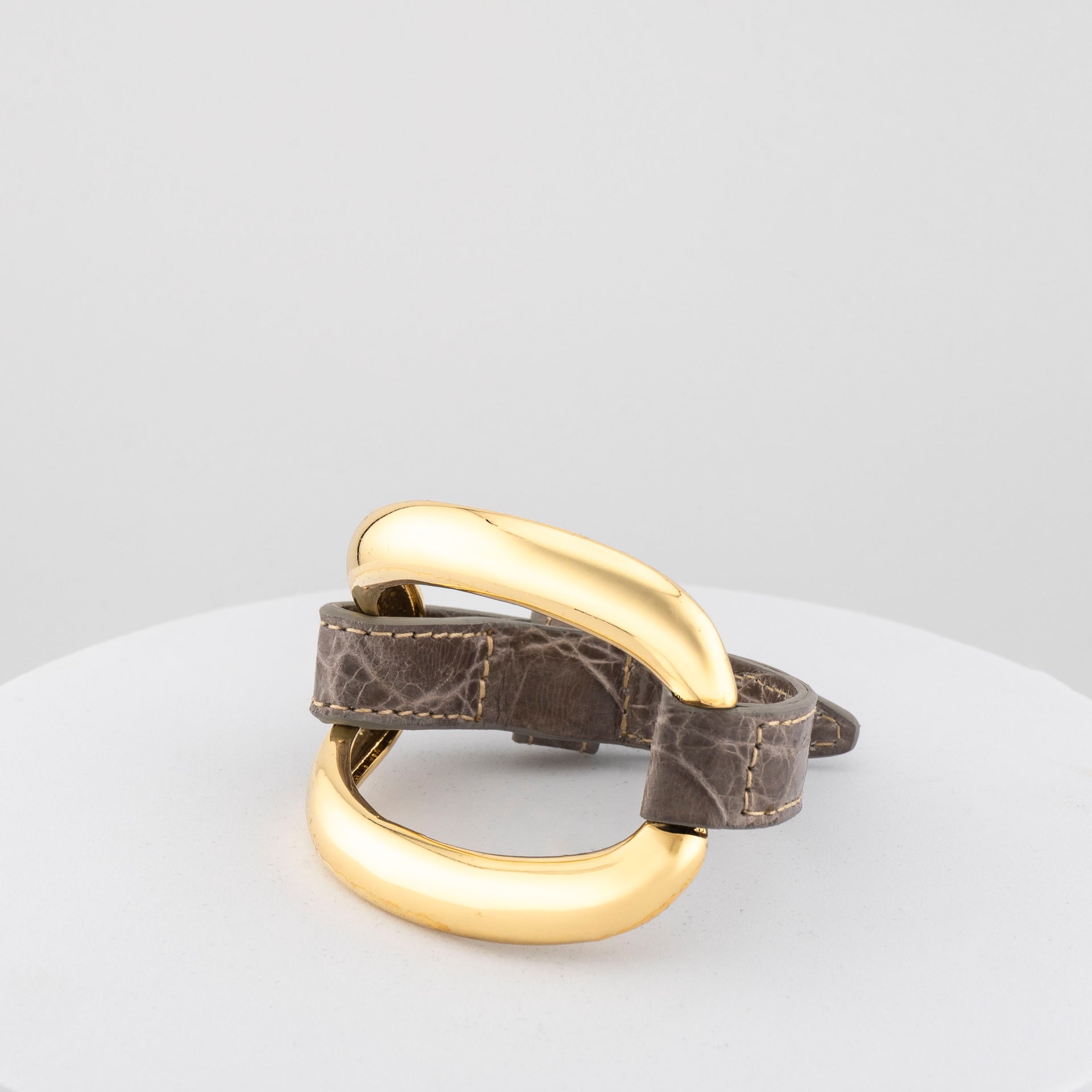 Realizzato in microfusione di bronzo a cera persa, placcato oro 18 carati, presenta un elemento ellittico asimmetrico che dialoga con un cinturino in vera pelle di coccodrillo cucito a mano, rendendo ogni creazione unica e irripetibile.