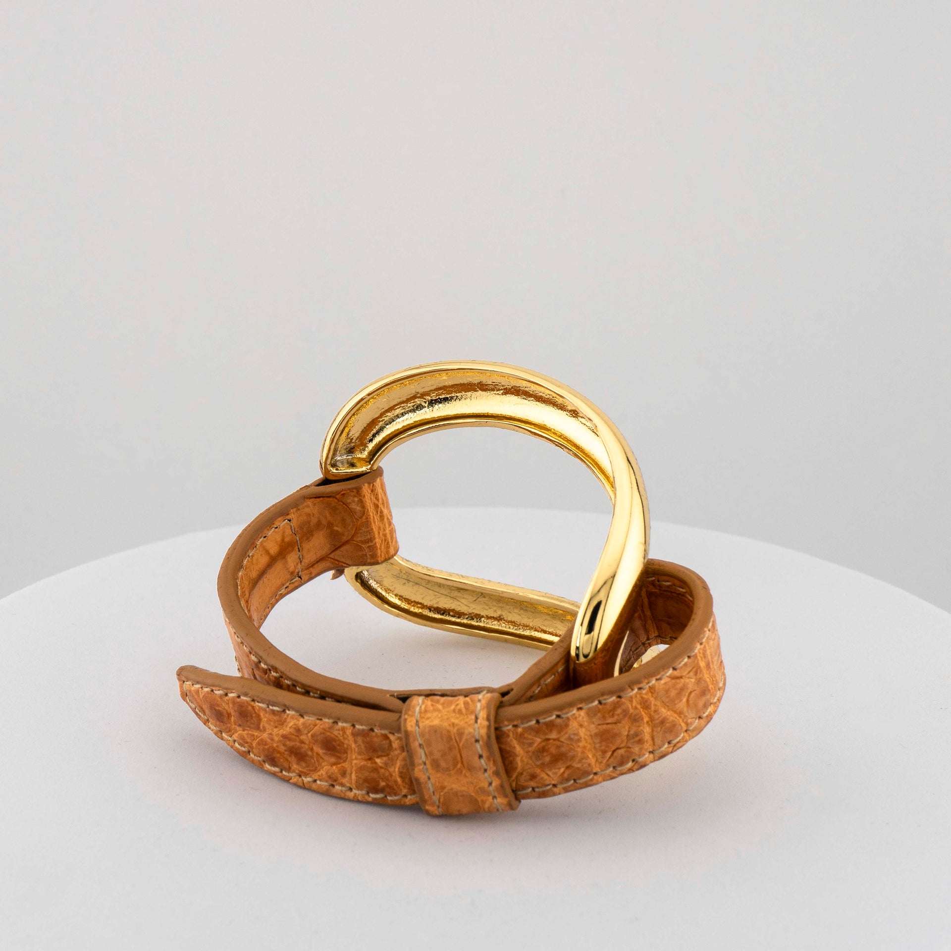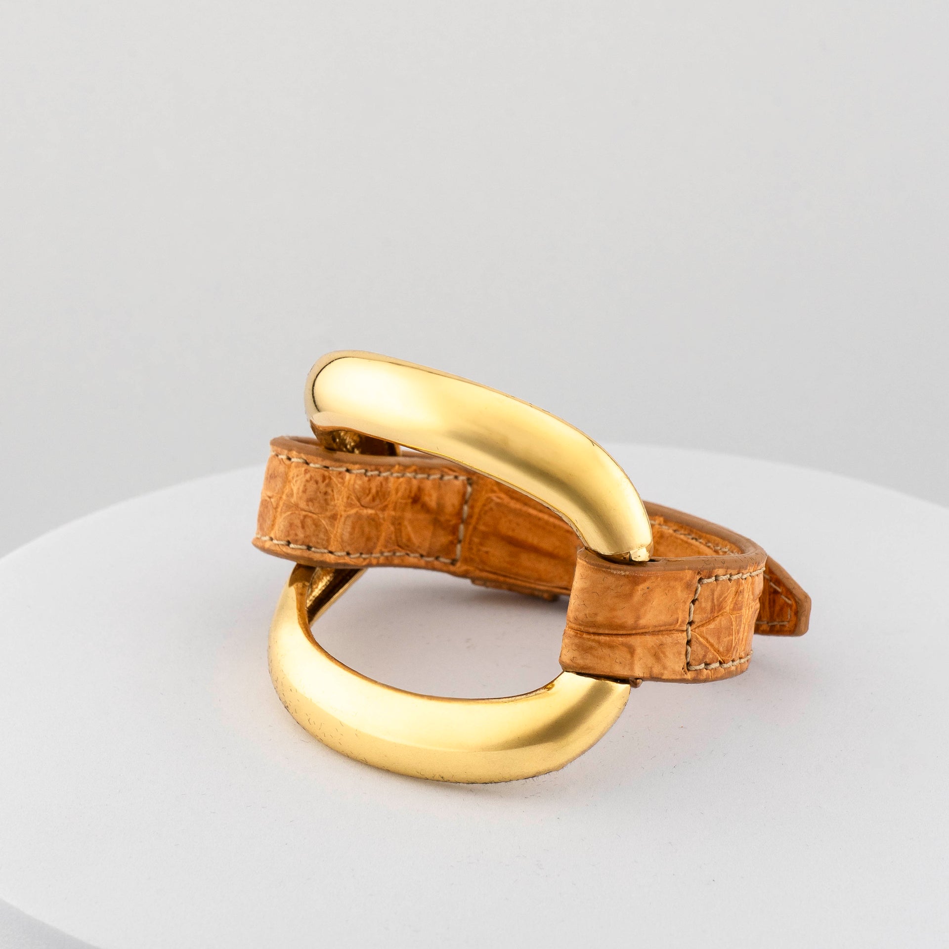 Realizzato in microfusione di bronzo a cera persa, placcato oro 18 carati, presenta un elemento ellittico asimmetrico che dialoga con un cinturino in vera pelle di coccodrillo cucito a mano, rendendo ogni creazione unica e irripetibile.