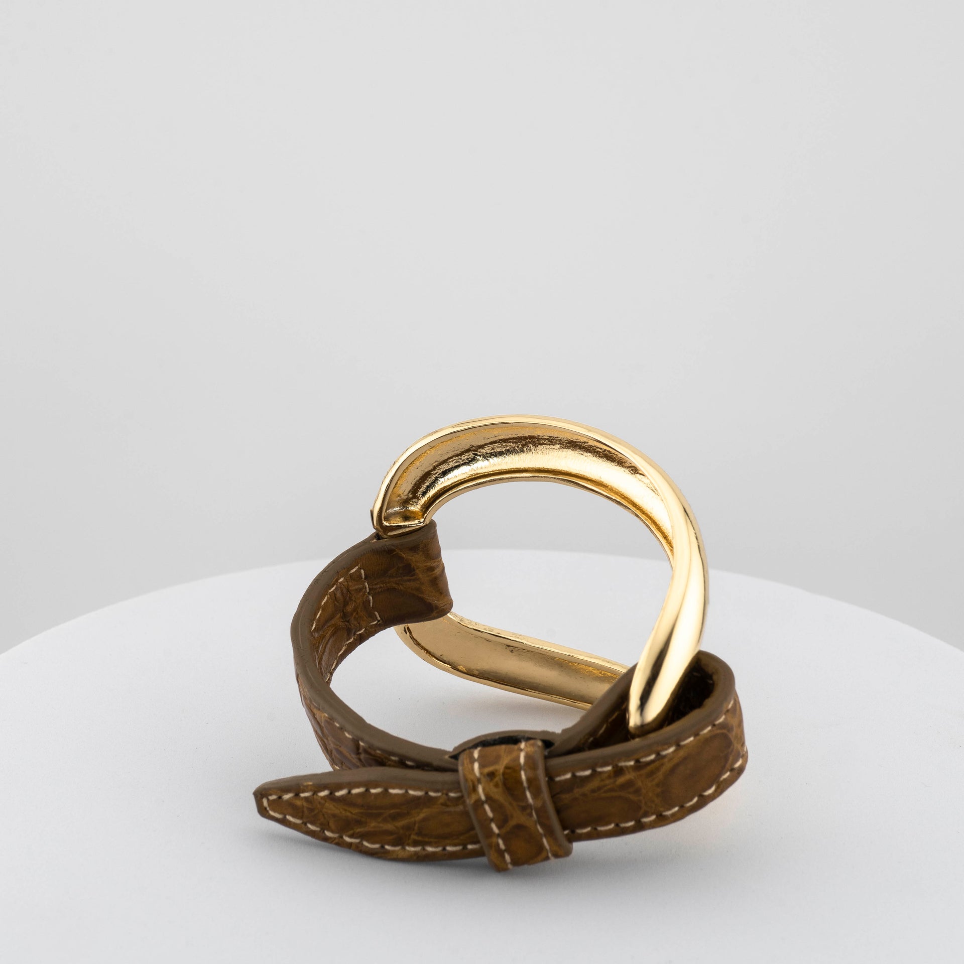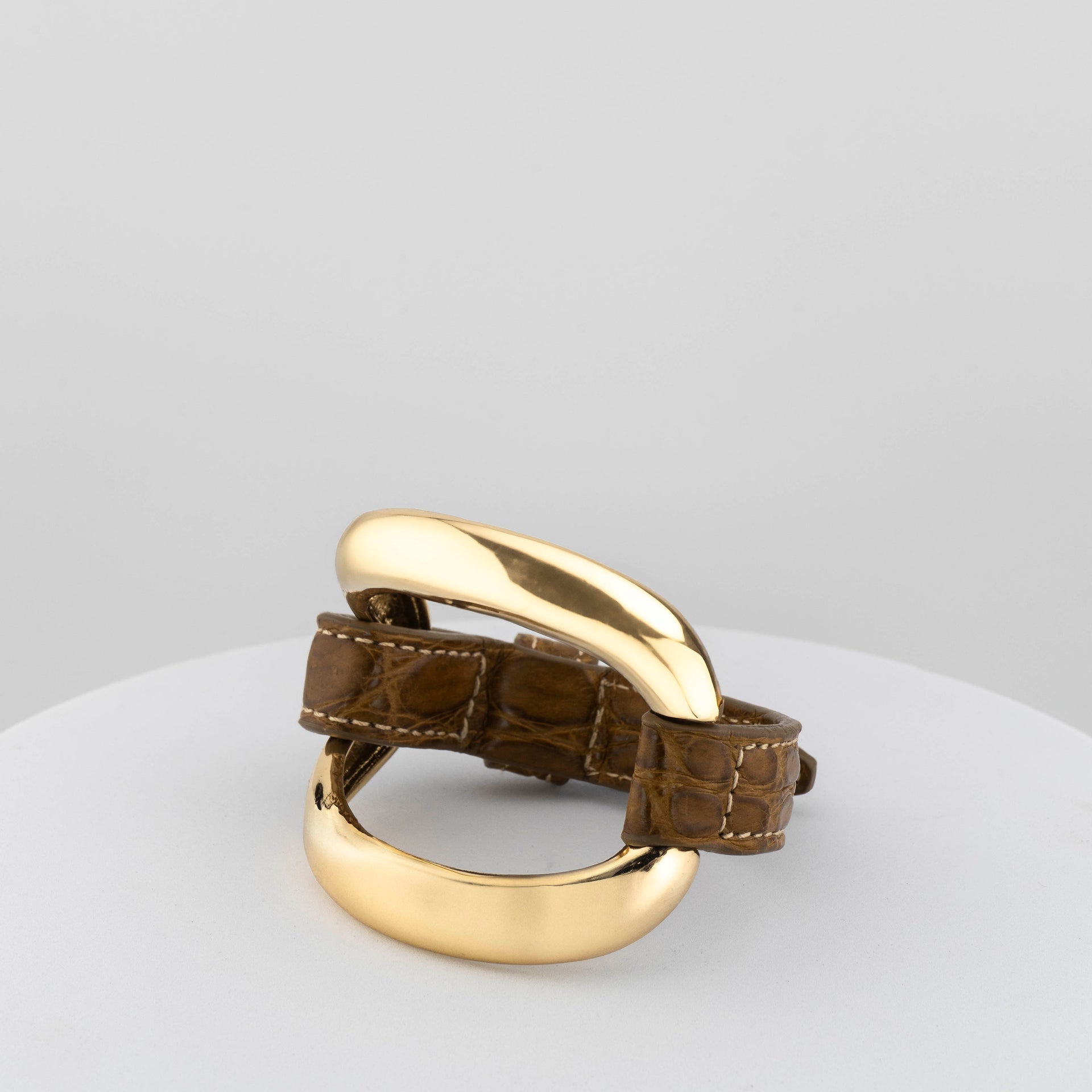 Realizzato in microfusione di bronzo a cera persa, placcato oro 18 carati, presenta un elemento ellittico asimmetrico che dialoga con un cinturino in vera pelle di coccodrillo cucito a mano, rendendo ogni creazione unica e irripetibile.