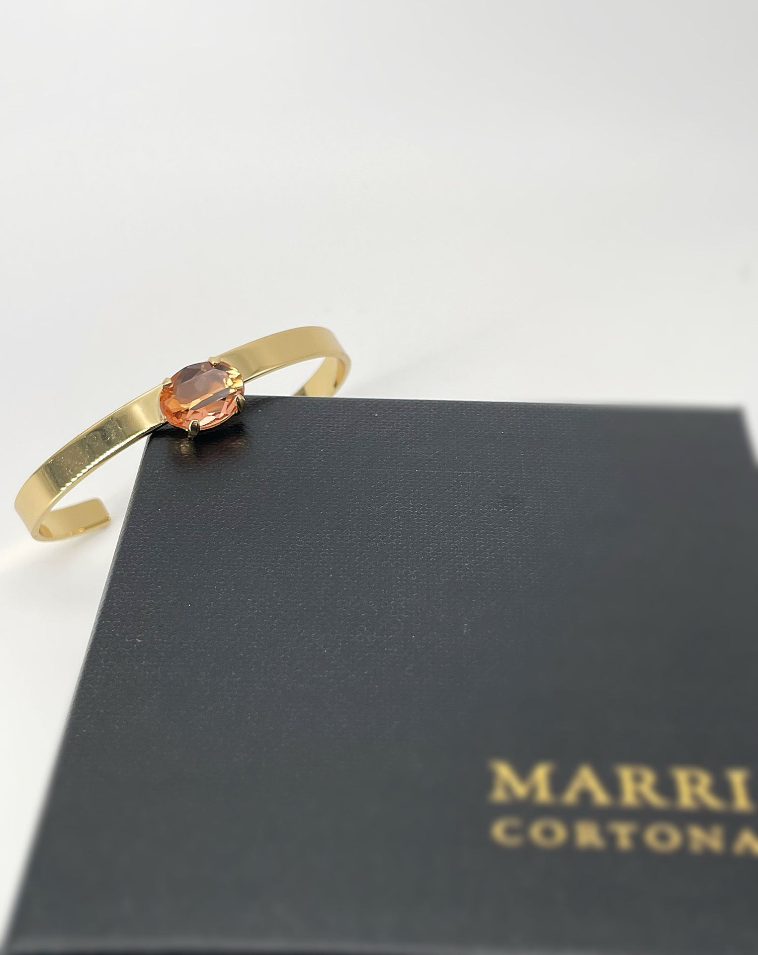 Il Bracciale Cristallo MarriCortona a fascia dal design contemporaneo, con una pietra ovale incastonata in modo asimmetrico cattura la luce da ogni angolazione. Realizzato a mano in Toscana dai nostri maestri artigiani, questo gioiello unisce eleganza e creatività, permettendoti di giocare con i colori e le combinazioni. La sua versatilità consente di abbinarlo ad altri bracciali della stessa linea, creando una fascia larga a doppia pietra sempre diversa e unica, riflesso del tuo stile e della tua personalità.