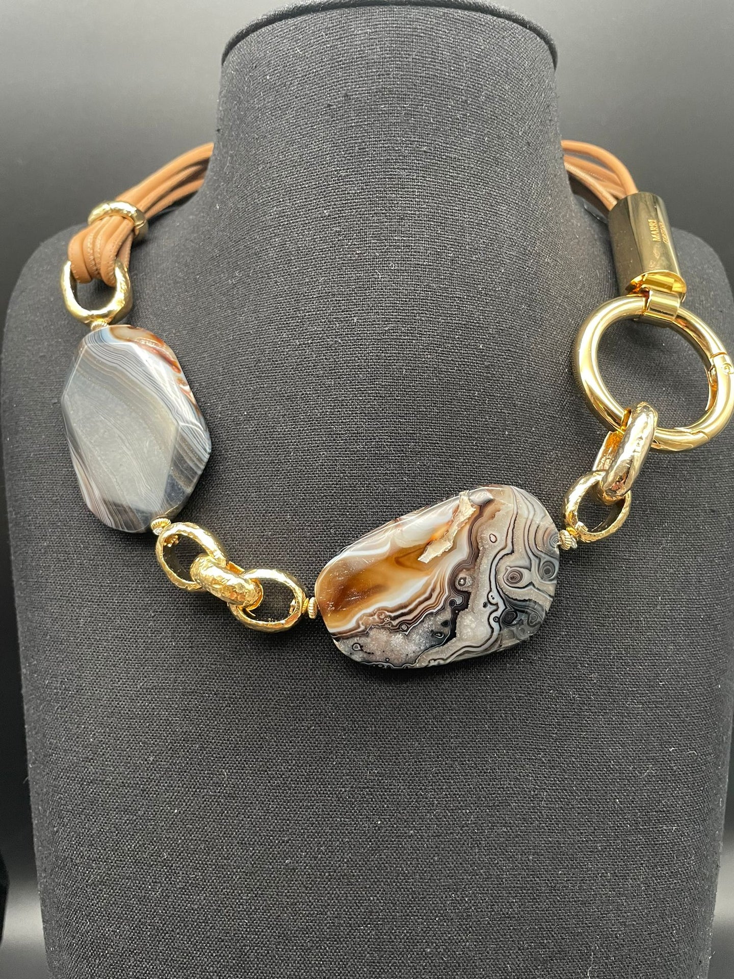 Collana Amarcord con girocollo in pelle di nappa color cuoio con Agata tiger Nero striata