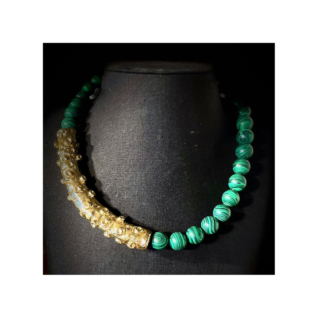 Collana Octopus con malachite, la pietra dalle virtu' magiche. Era la pietra che rivestiva il copricapo dei Faraoni per donar loro saggezza, la pietra delle Dee dell'Amore e della Sapienza. Ogni pietra è stata accuratamente selezionata per la sua bellezza e luminosità, mentre il tentacolo di polipo è stato plasmato con maestria e creatività, dando vita a un elemento unico e sorprendente.