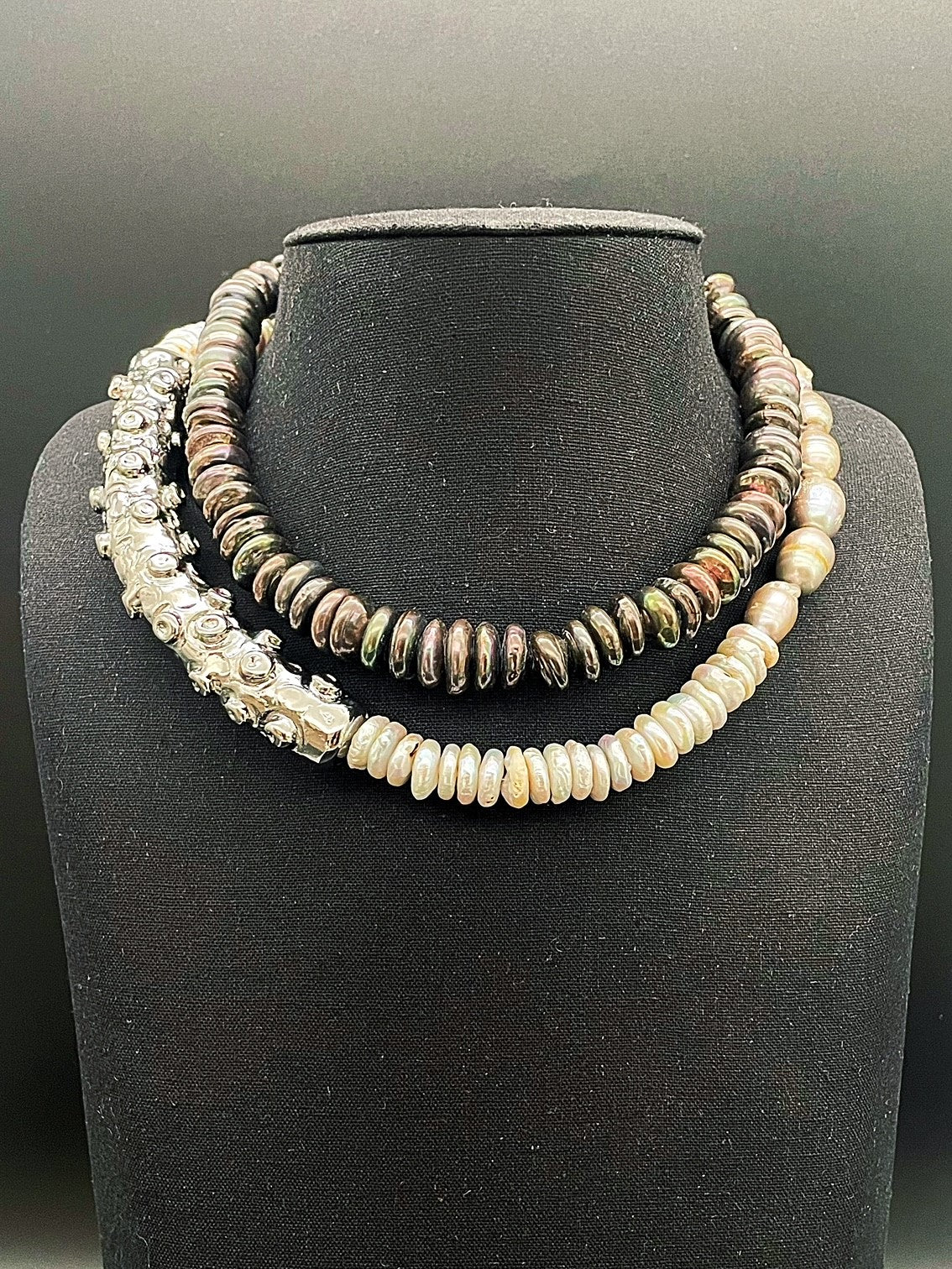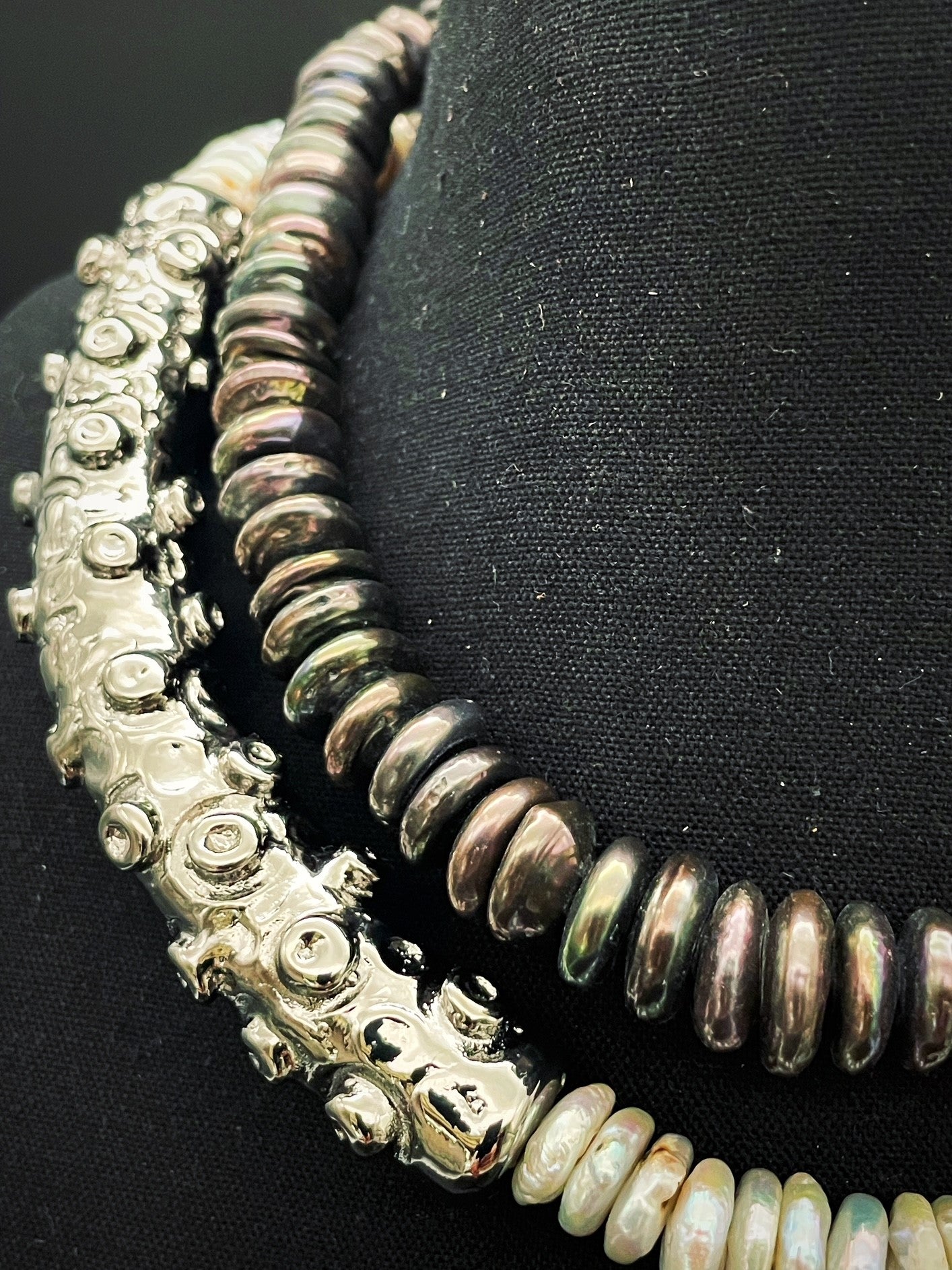 Collana Octopus, girocollo, regolabile in lunghezza. Un elemento asimmetrico in bronzo bianco, a tentacolo di polipo, avvolge perle vere coltivate, a disco, in bianco e grigio, oltre che perle giganti ovali grige, in tonalità bianco-nero. Finitura in oro 18 carati, oro bianco, anticato.