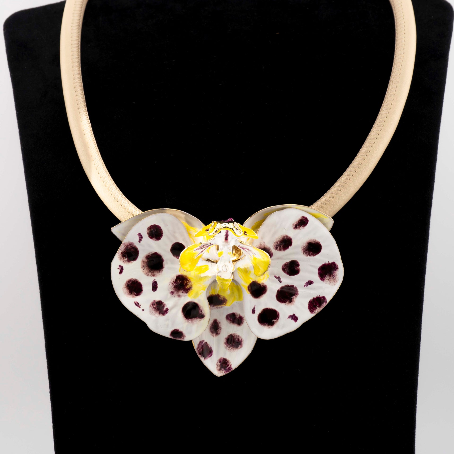 Realizzata in argento 925 e rifinita con un bagno in oro 18 carati, presenta un pendente a forma di orchidea, dipinto a mano in smalto dai nostri artigiani.