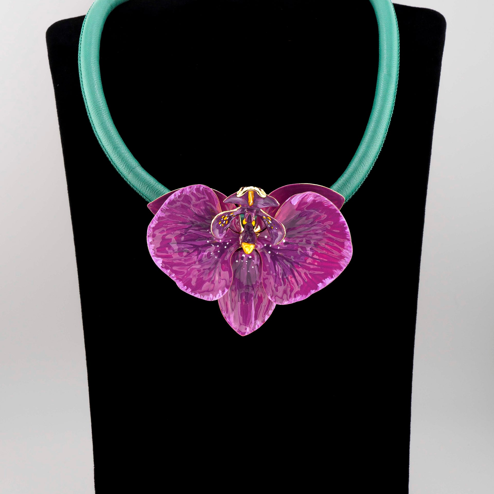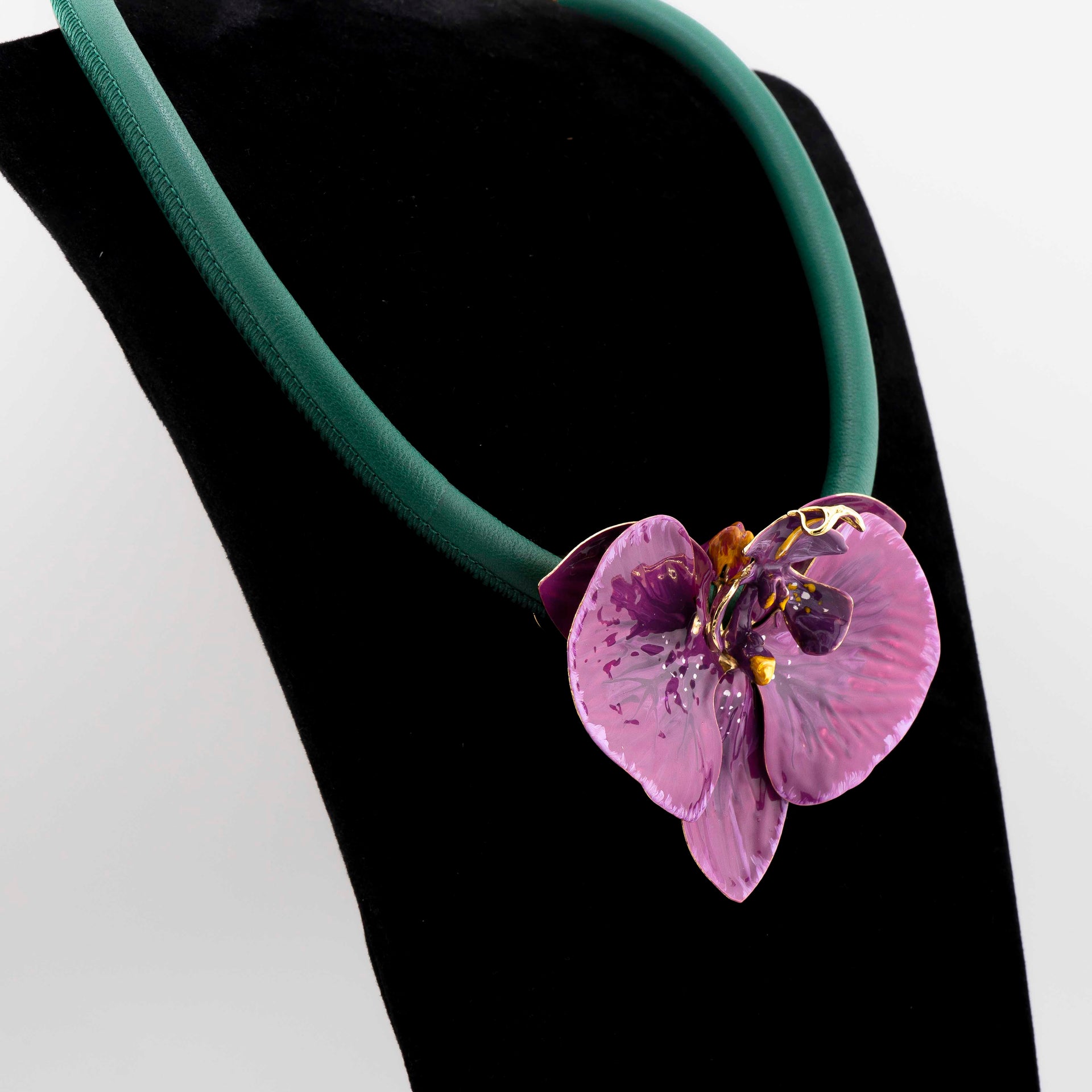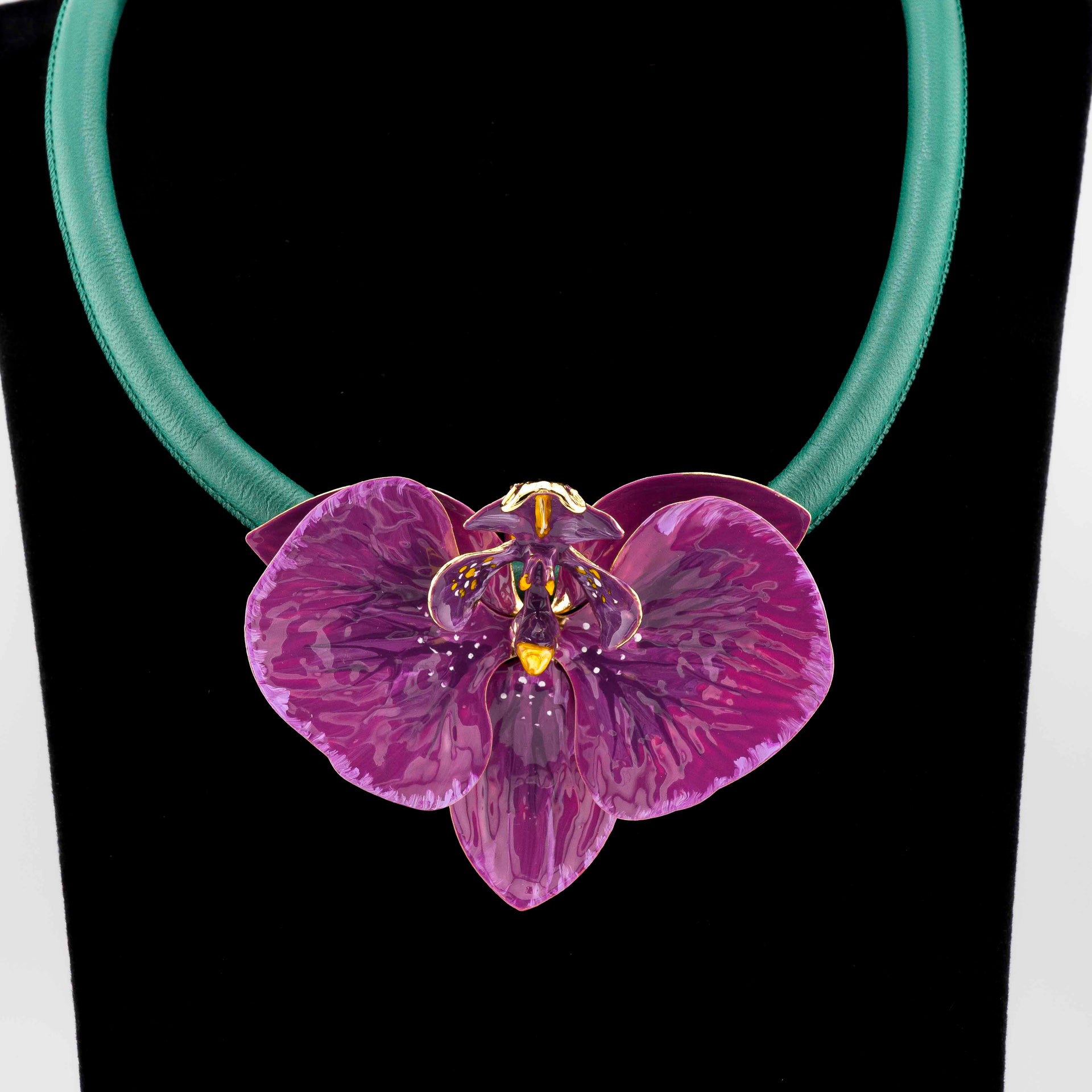 Realizzata in argento 925 e rifinita con un bagno in oro 18 carati, presenta un pendente a forma di orchidea, dipinto a mano in smalto dai nostri artigiani.