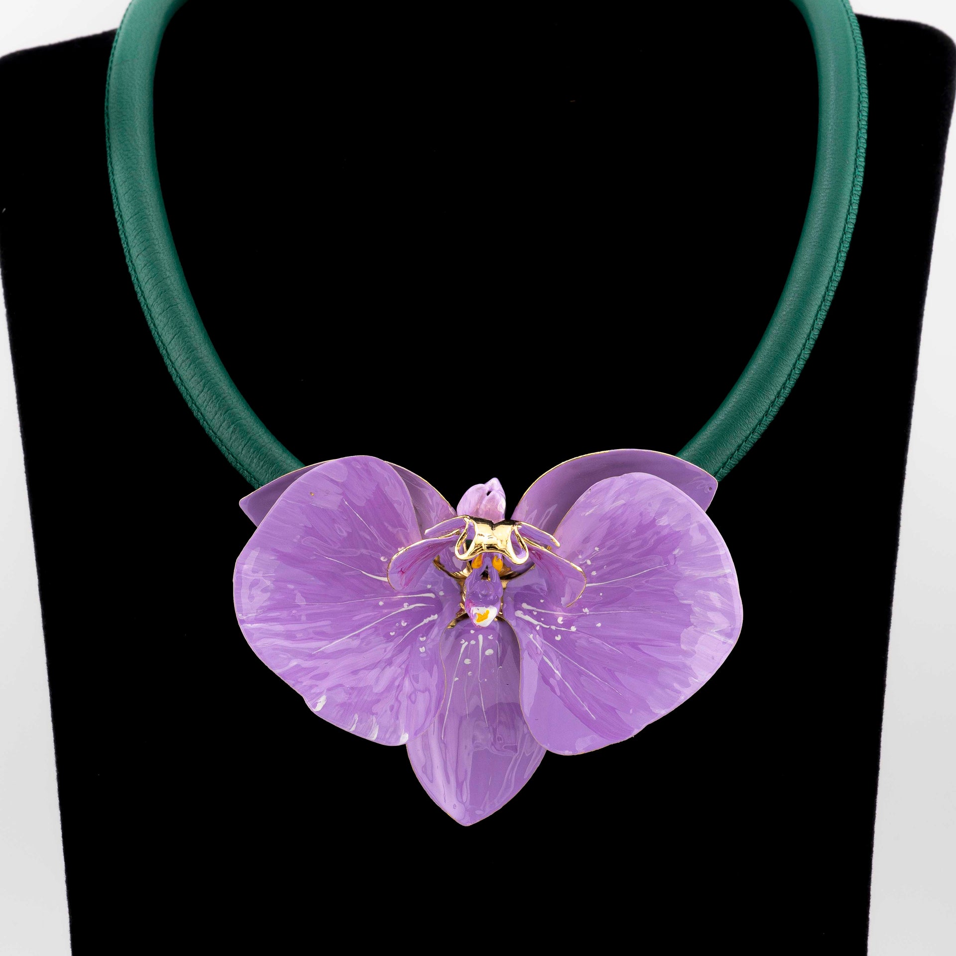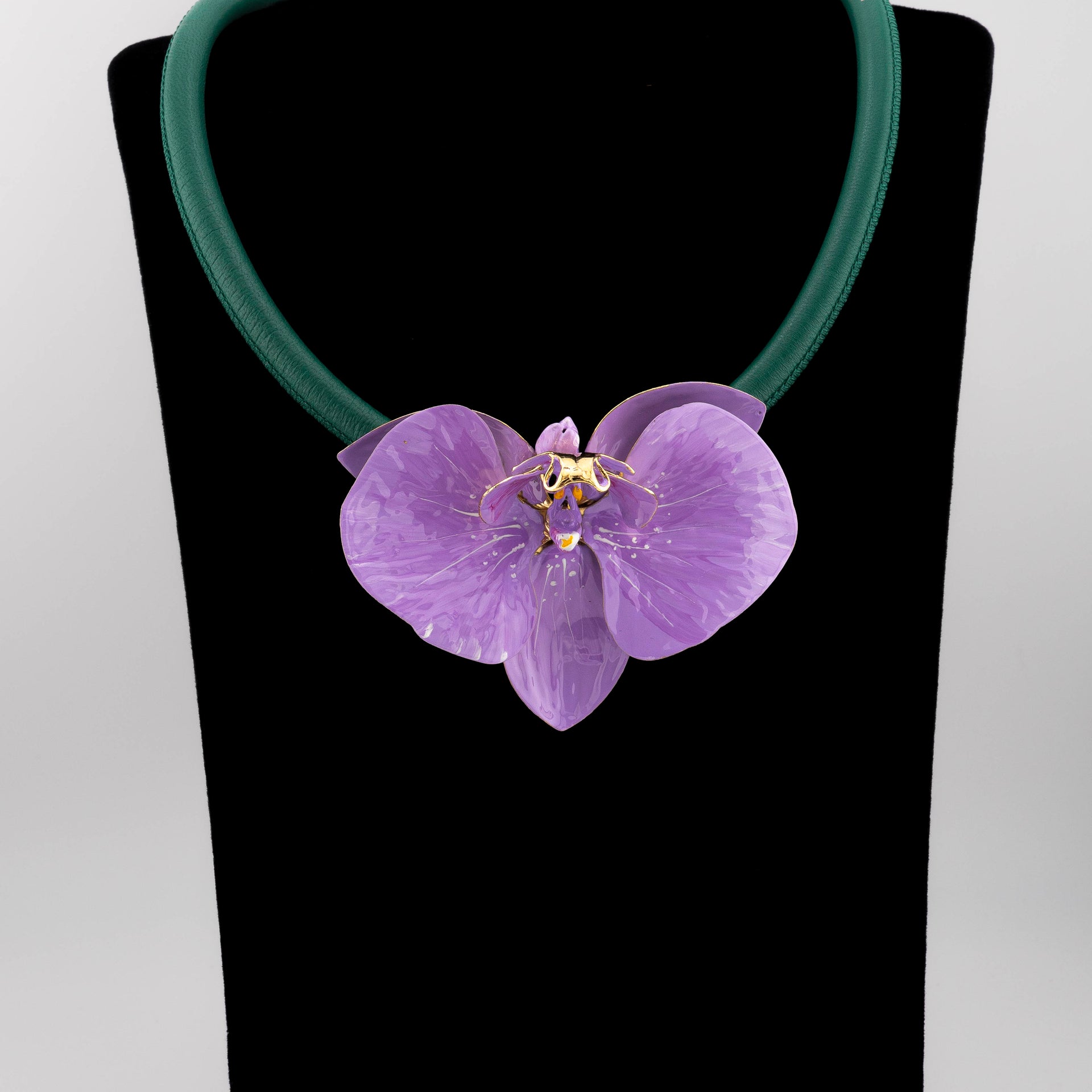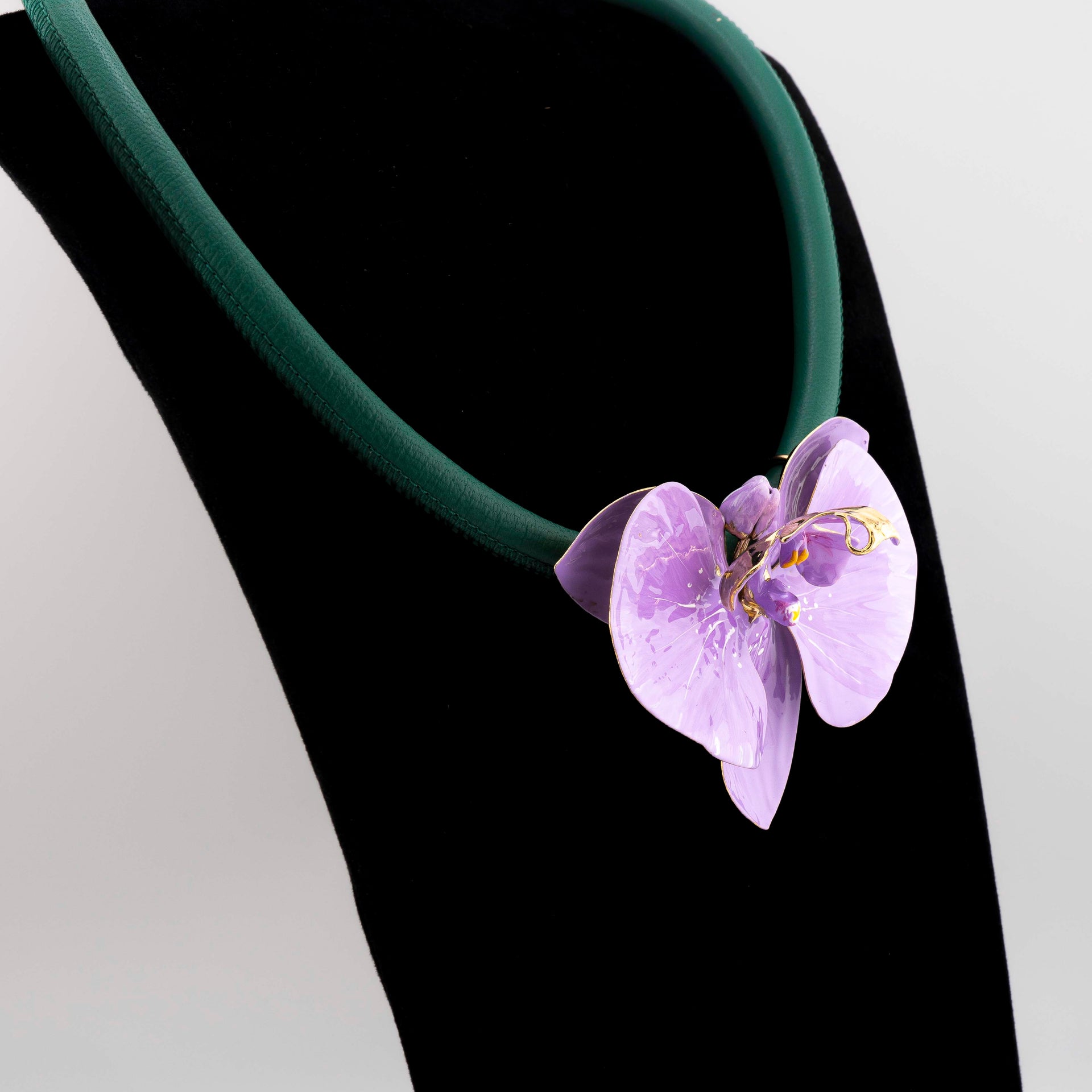 Realizzata in argento 925 e rifinita con un bagno in oro 18 carati, presenta un pendente a forma di orchidea, dipinto a mano in smalto dai nostri artigiani.