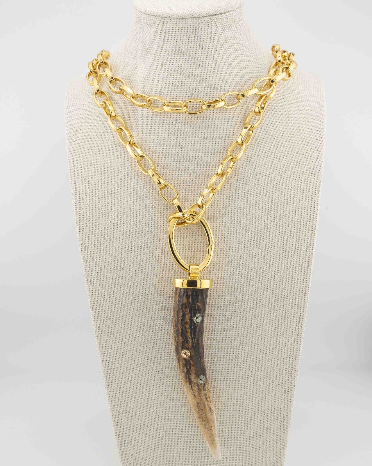 La collana con Corno di cervo MarriCortona è realizzata in bronzo bianco con bagno oro 18 carati. Il pendente è una punta di corna di cervo. Le corna di cervo esprimono il rinnovamento continuo della vita, infatti annualmente cadono e ricrescono con nuove ramificazioni, simboleggiando la rinascita, l'aumento della forza, dell'esperienza ancorché dell'età. Texture uniche e colori naturali dal bianco al bruno, passando per il grigio. Fatto a mano in Toscana.