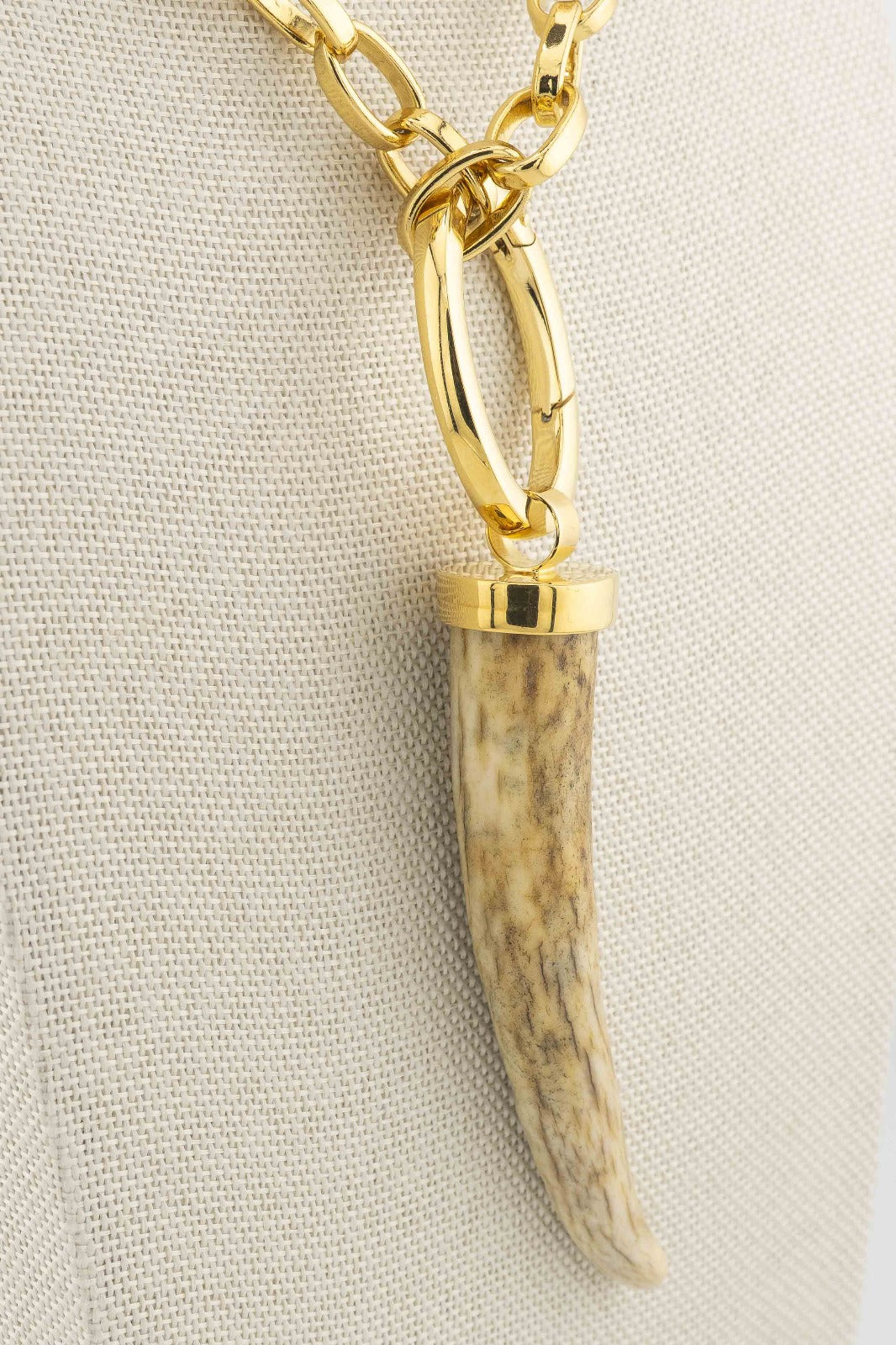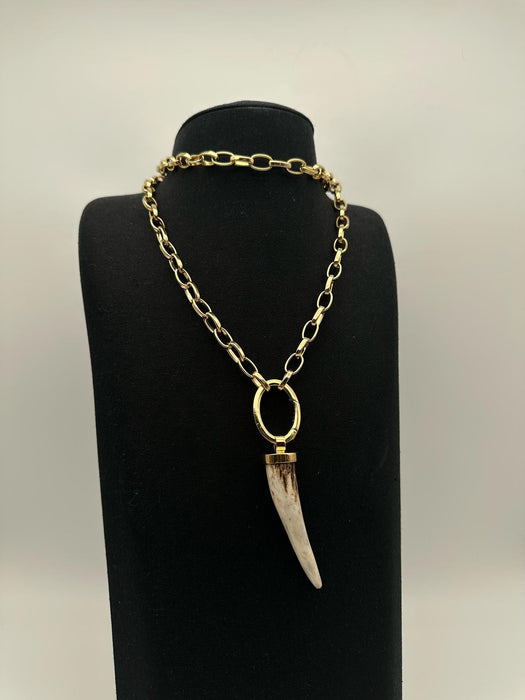 La collana con Corno di cervo Marri Cortona è realizzata in bronzo bianco con bagno oro 18 carati. Il pendente è una punta di corna di cervo. Le corna di cervo esprimono il rinnovamento continuo della vita, infatti annualmente cadono e ricrescono con nuove ramificazioni, simboleggiando la rinascita, l'aumento della forza, dell'esperienza ancorché dell'età. Texture uniche e colori naturali dal bianco al bruno, passando per il grigio. Fatto a mano in Toscana.