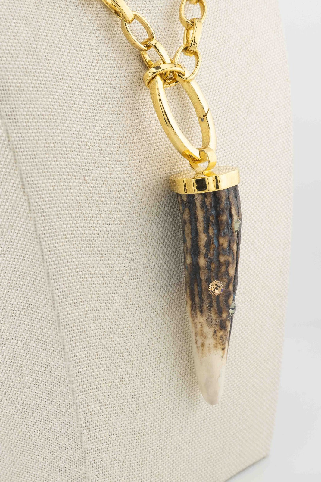 La collana con Corno di cervo MarriCortona è realizzata in bronzo bianco con bagno oro 18 carati. Il pendente è una punta di corna di cervo. Le corna di cervo esprimono il rinnovamento continuo della vita, infatti annualmente cadono e ricrescono con nuove ramificazioni, simboleggiando la rinascita, l'aumento della forza, dell'esperienza ancorché dell'età. Texture uniche e colori naturali dal bianco al bruno, passando per il grigio. Fatto a mano in Toscana.