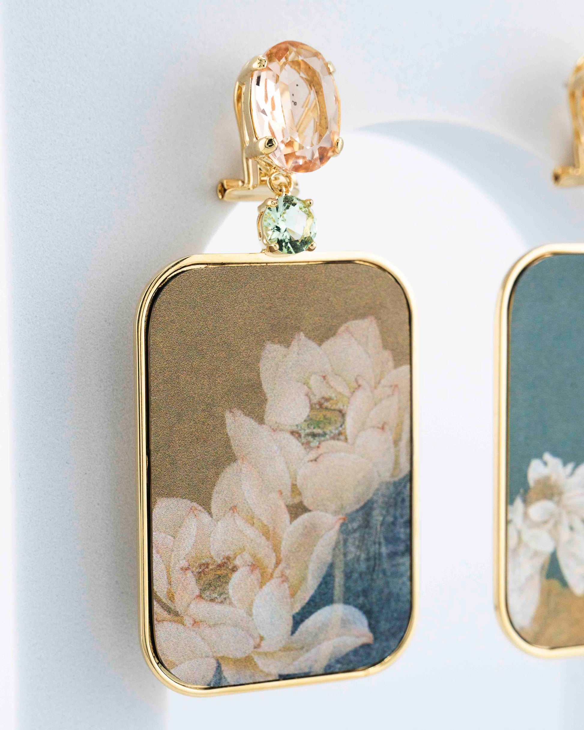 Le linee sottili e le sfumature leggere creano un equilibrio armonioso tra luce e materia, trasformando il disegno in un gioiello di raffinata eleganza. La stampa su metallo restituisce ogni dettaglio con precisione pittorica, impreziosita da cristalli Swarovski e illuminata dalla placcatura in oro 18 carati.