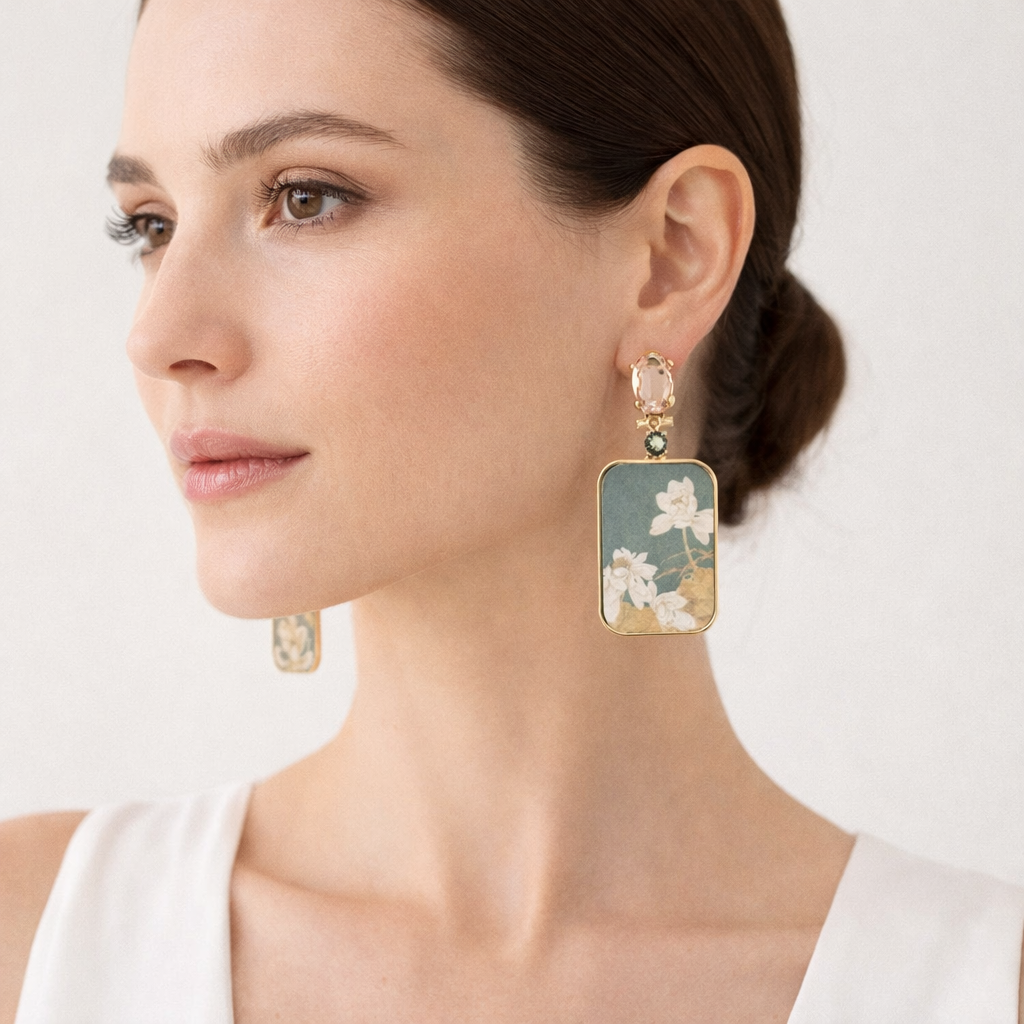 Petali avorio si aprono con grazia su fondi verde salvia e oro tenue, evocando la delicatezza delle antiche stampe giapponesi. “Giardino di Giada” racconta una bellezza silenziosa, pura, sospesa nel tempo.